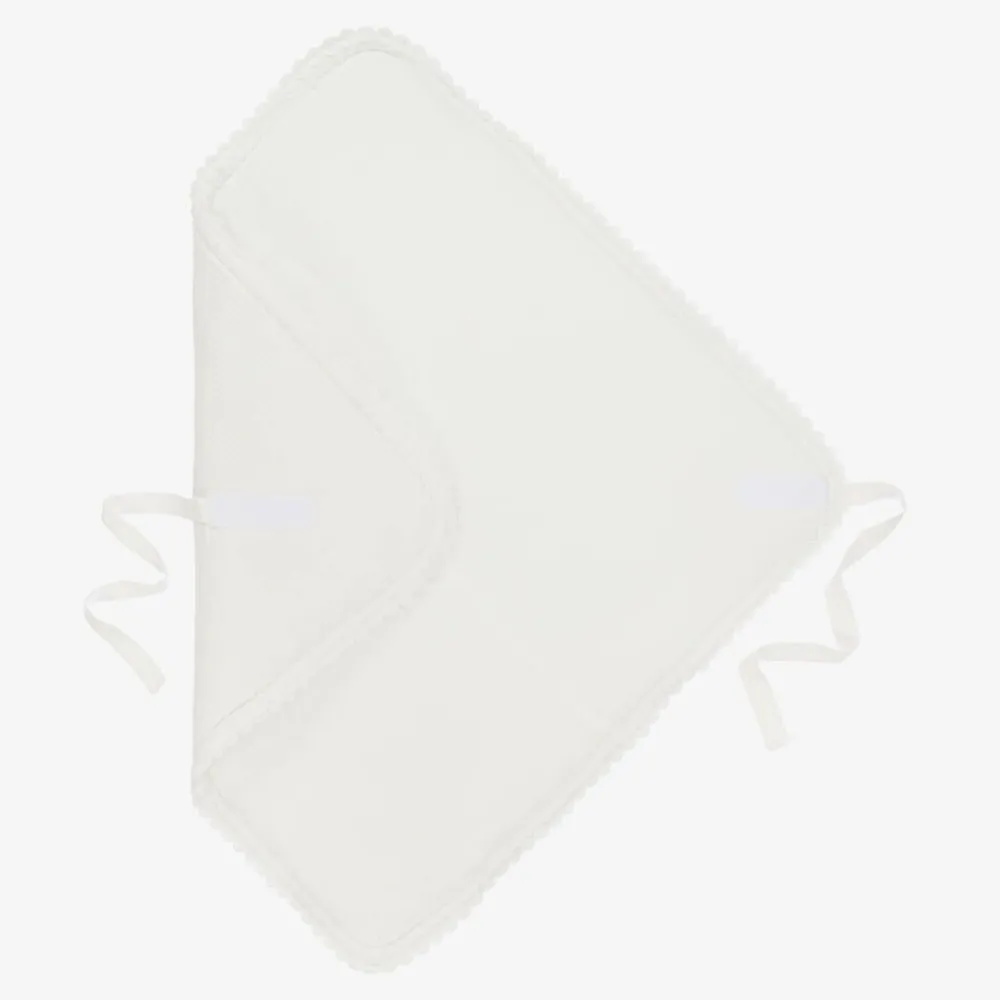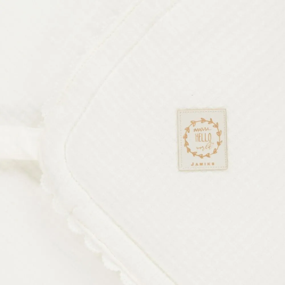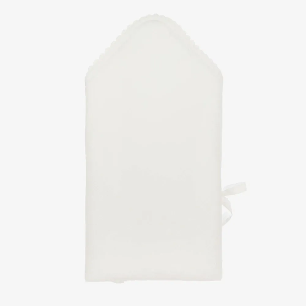 White, warmly padded nest for baby boys and girls by Jamiks, with pretty, scalloped lace trims. In a wrap-around style, it is made in basket weave organic cotton, with a soft, cotton cheesecloth lining. It fastens with velcro and basket weave ties on one side. On the front is a white and gold logo badge.