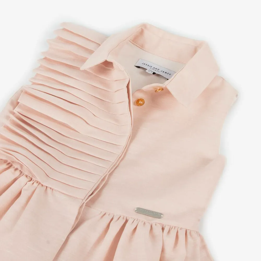Exclusive to Childrensalon, a pink sleeveless dress for girls by Jessie and James London. Woven in a cotton blend and fully lined for comfort, this chic shirt dress has a pointed collar and a stylish, pleated frill on the bodice. It fastens neatly with concealed buttons and has a logo plate on the waistline for a designer finishing touch.
