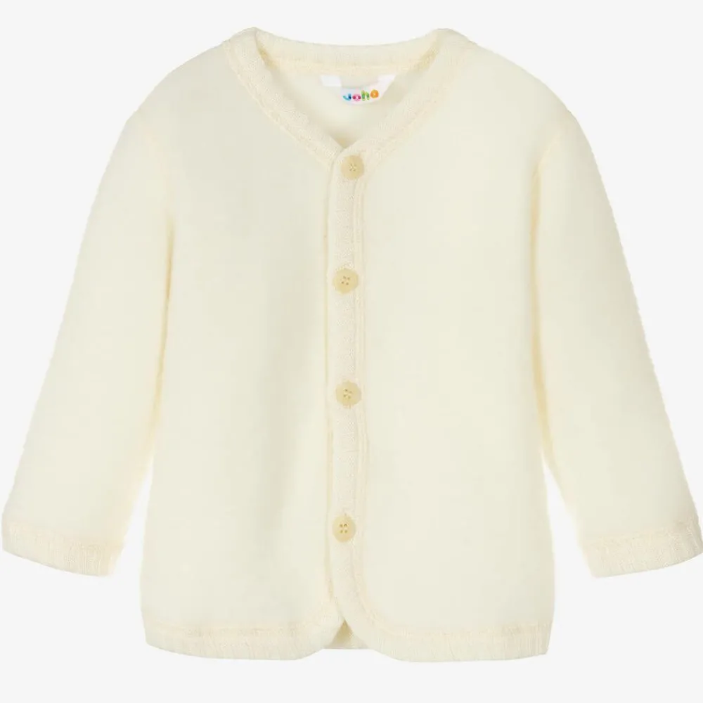 Ivory thermal cardigan for little boys and girls, by Danish designer Joha. Expertly made in luxuriously soft and insulating Merino wool, this unisex cardigan has a rainbow striped logo on the side seam, and ribbed trims. Lovely for layering, it is designed to help regulate the body's temperature and keep your little one warm.