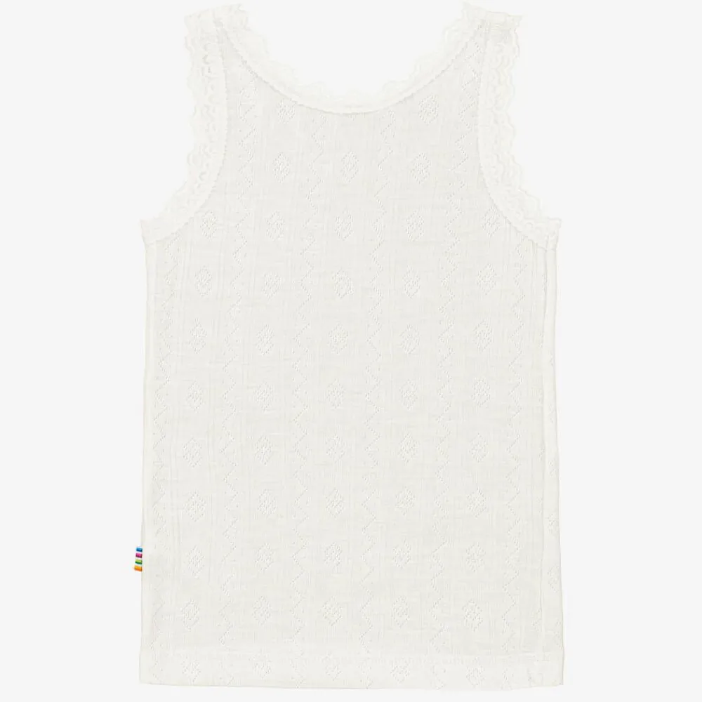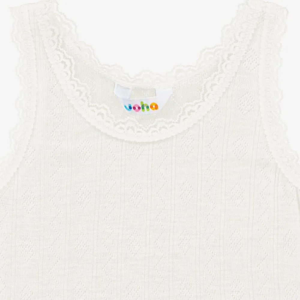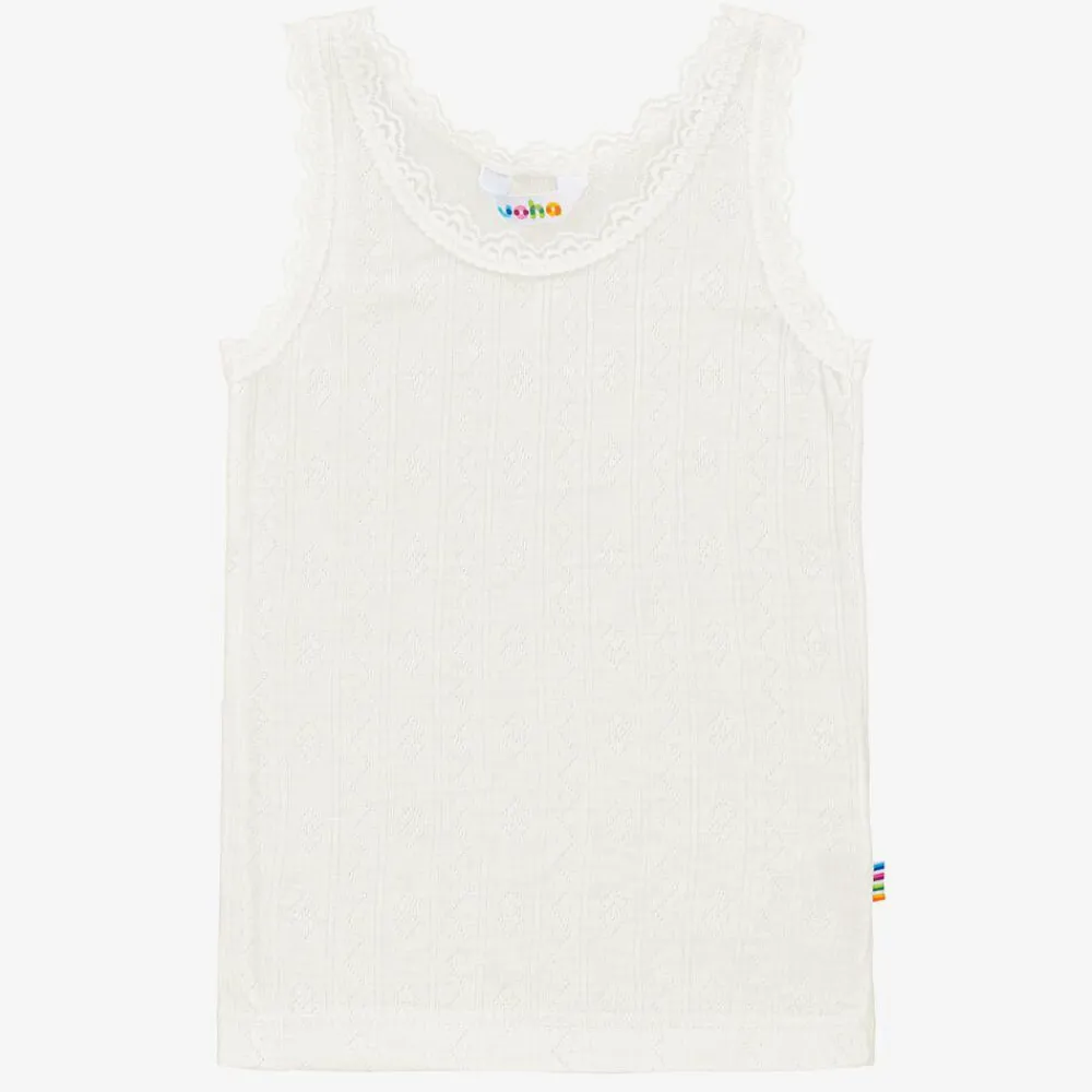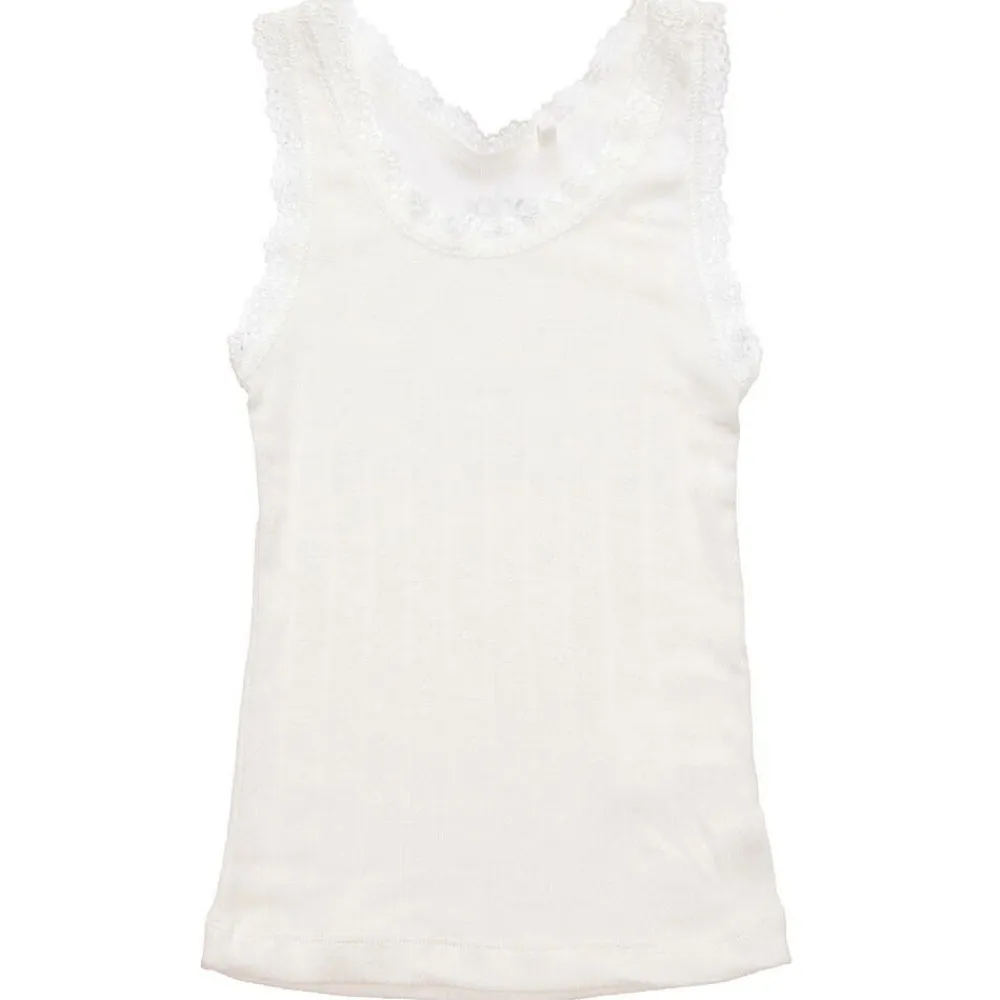 A ivory thermal vest top with pretty lace trims for girls by Joha. Super soft and comfortable, it is made in a lightweight Merino wool and silk blend.