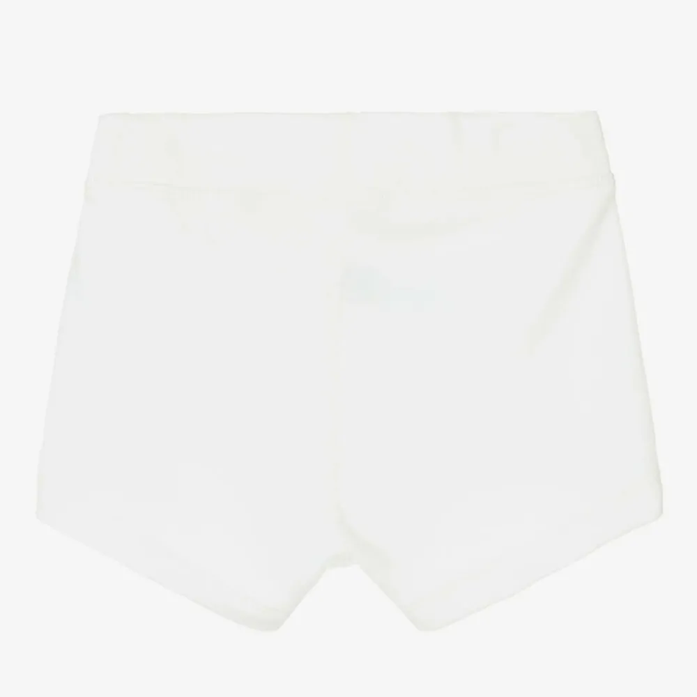 Ivory boxer shorts for boys, by Joha. Made in a luxuriously soft wool and organic cotton blend, these jersey boxers have a comfortable stretchy waist, and a cute rainbow striped logo tab. The outside has a brushed effect and the inside is ribbed, ensuring a warm and comfortable fit.