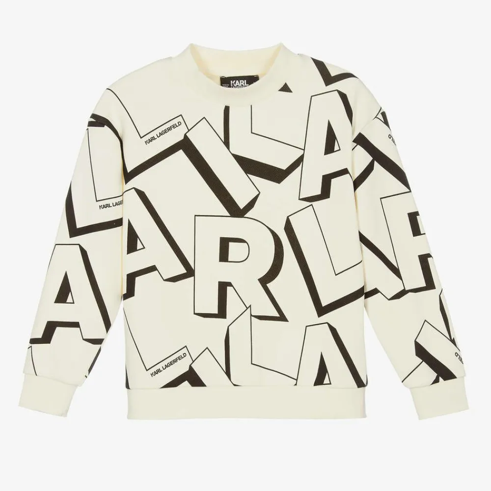 An ivory sweatshirt for boys by KARL LAGERFELD KIDS, made in soft, mid-weight organic cotton jersey for comfortable wear. Casually styled with a crew neckline and stretchy ribbed trims, it is patterned all over in a cool 'KARL' logo design in black, for instant brand recognition.