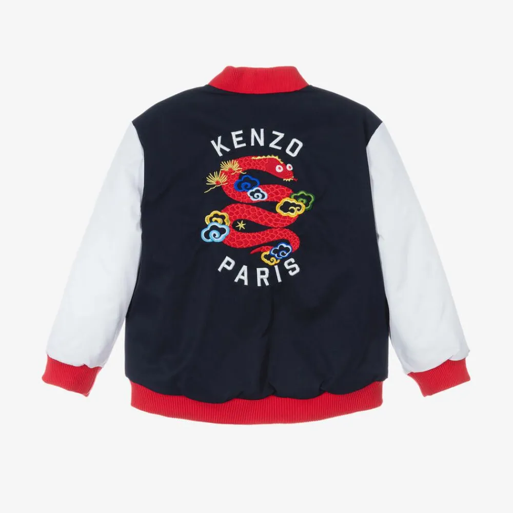 Padded navy blue and white varsity jacket for boys and girls by KENZO KIDS, made in silky twill with red trims. Elaborate snake and logo embroidery shows it is part of the Lunar New Year capsule collection. It has a sumptuous, silky red quilted lining.