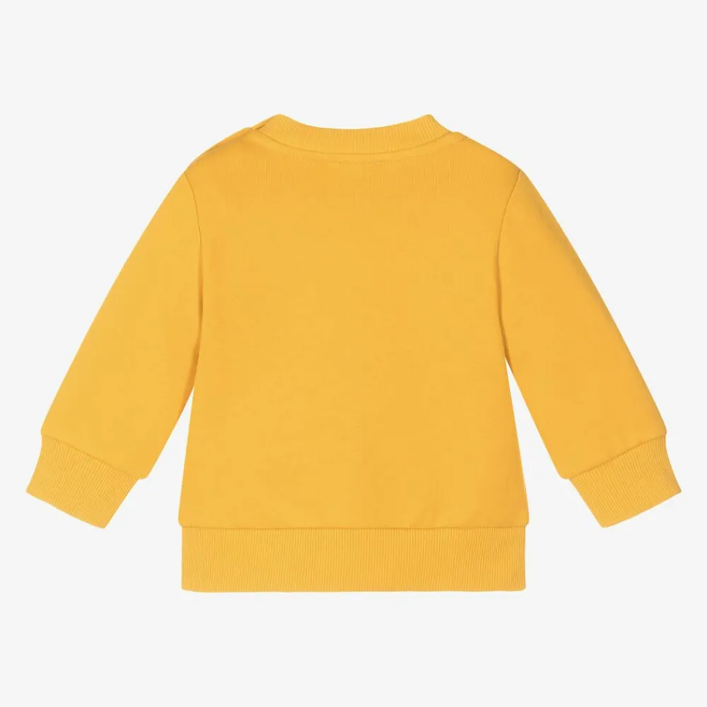 Bright yellow sweatshirt for little boys by KENZO KIDS, made in soft, mid-weight cotton jersey with a warm fleecy inside. It features a cute yellow and black tiger and green logo motif on the front. This casual top has cosy ribbed trims and branded popper fastenings on one shoulder.
