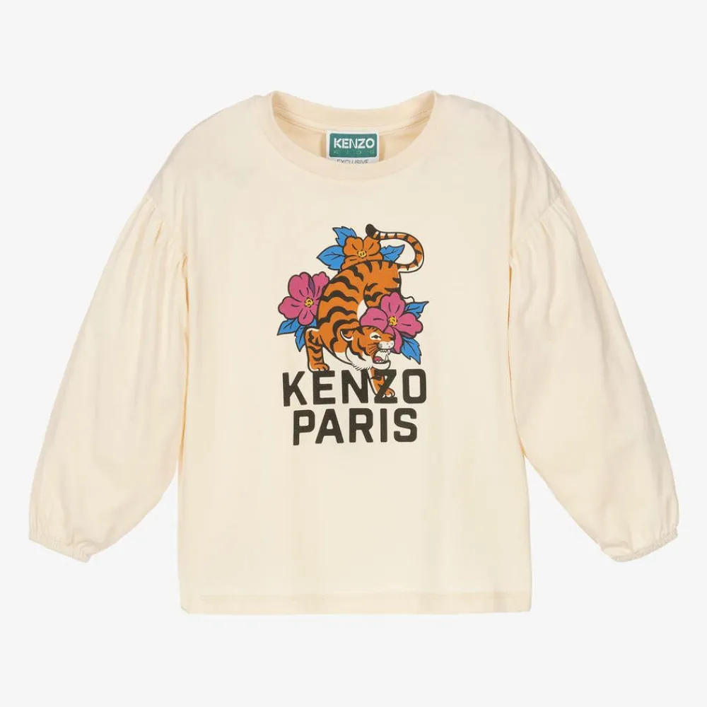 Ivory top for girls by KENZO KIDS, made in soft cotton jersey. It has a bold Kenzo Paris print on the front with an iconic tiger motif and cartoon-style flowers. The dropped shoulder seams are gently gathered and the cuffs are comfortably elasticated.