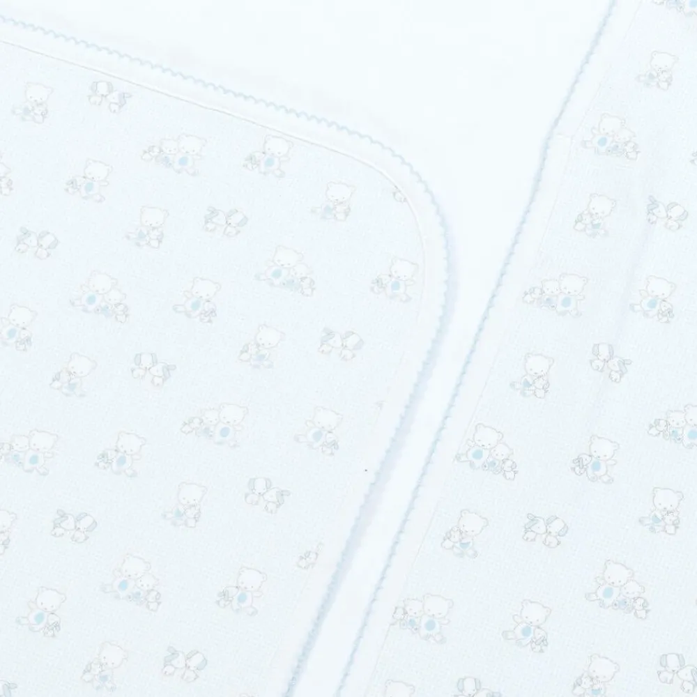 Pale blue blanket for baby boys by Kissy Kissy, patterned in tiny micro-dots with cute teddies and puppies. It is made in super soft Pima cotton jersey, with blue picot embroidery around the edges. Ideal for use in the pram or car seat, it also makes an attractive nursery accessory.