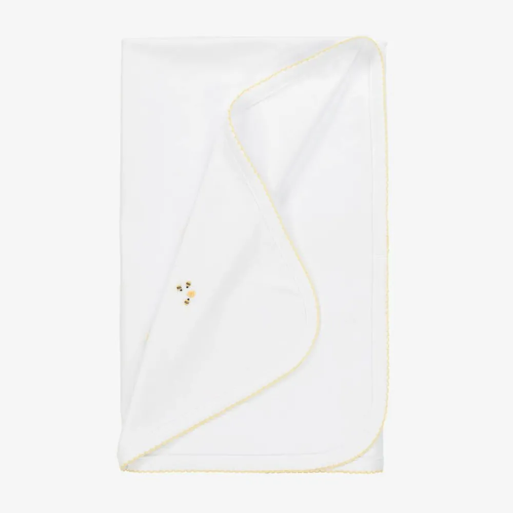 Delightfully soft, white Pima cotton blanket for baby boys and girls by Kissy Kissy. It is made in a double-layer jersey with a sweet, hand-embroidered bee hives motif and matching yellow picot border. Practical for use in the car seat or stroller, it is also adorable as a nursery accessory.