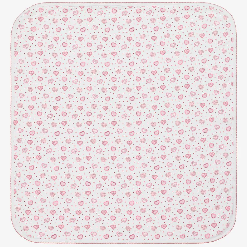 A white blanket for baby girls by Kissy Kissy, made in a double layer of super soft Pima cotton jersey. This charming nursery accessory is patterned with pink and red hearts and edged with an embroidered picot trim.