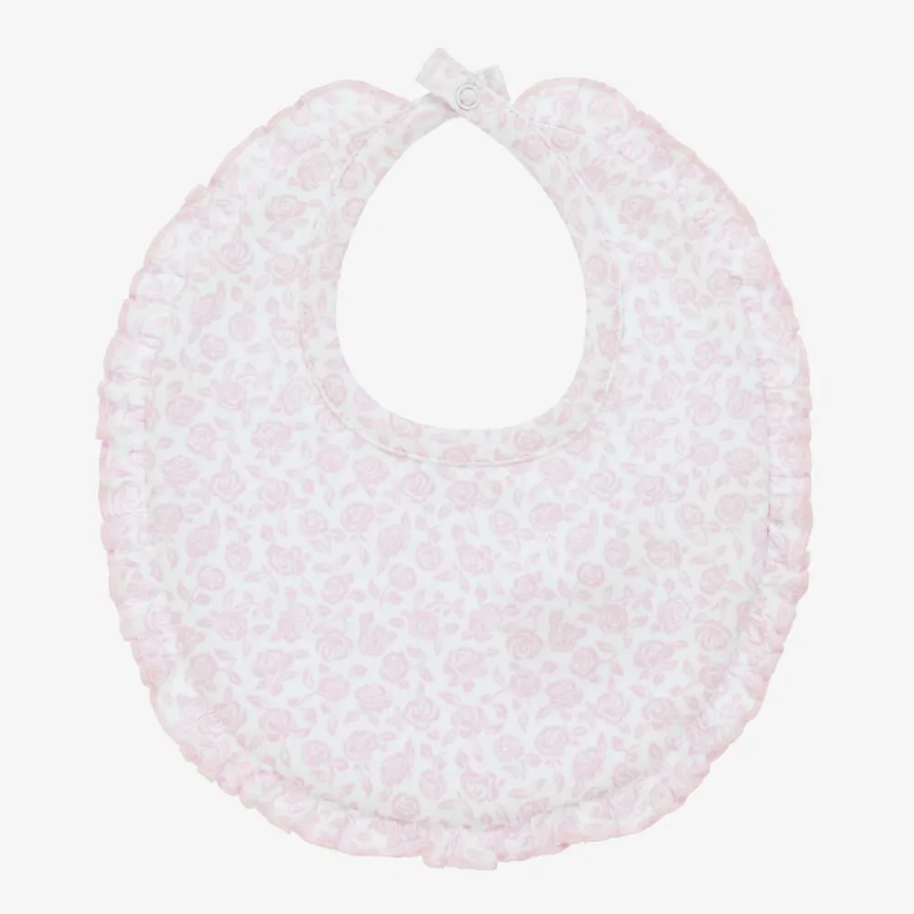 A pretty bib for baby girls by Kissy Kissy, patterned in pink flowers on a white background. It is made in a double layer of super soft Pima cotton jersey, with frilled trims. It secures easily with a single popper behind the back.