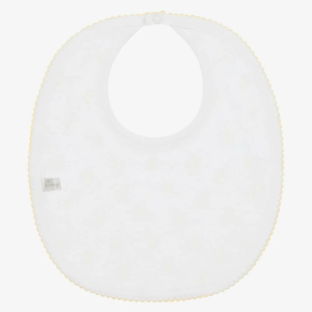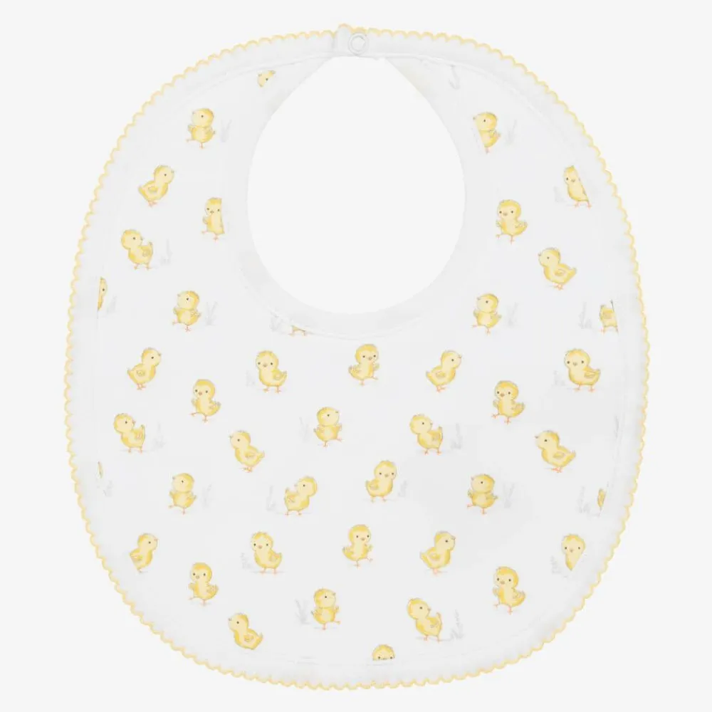 A cute white bib for baby boys and girls by Kissy Kissy, patterned with little yellow ducklings. Made in soft Pima cotton jersey, this useful feeding accessory is lined with towelling for extra absorbency. It has a delicate picot trim and fastens on the back of the neck with a popper.