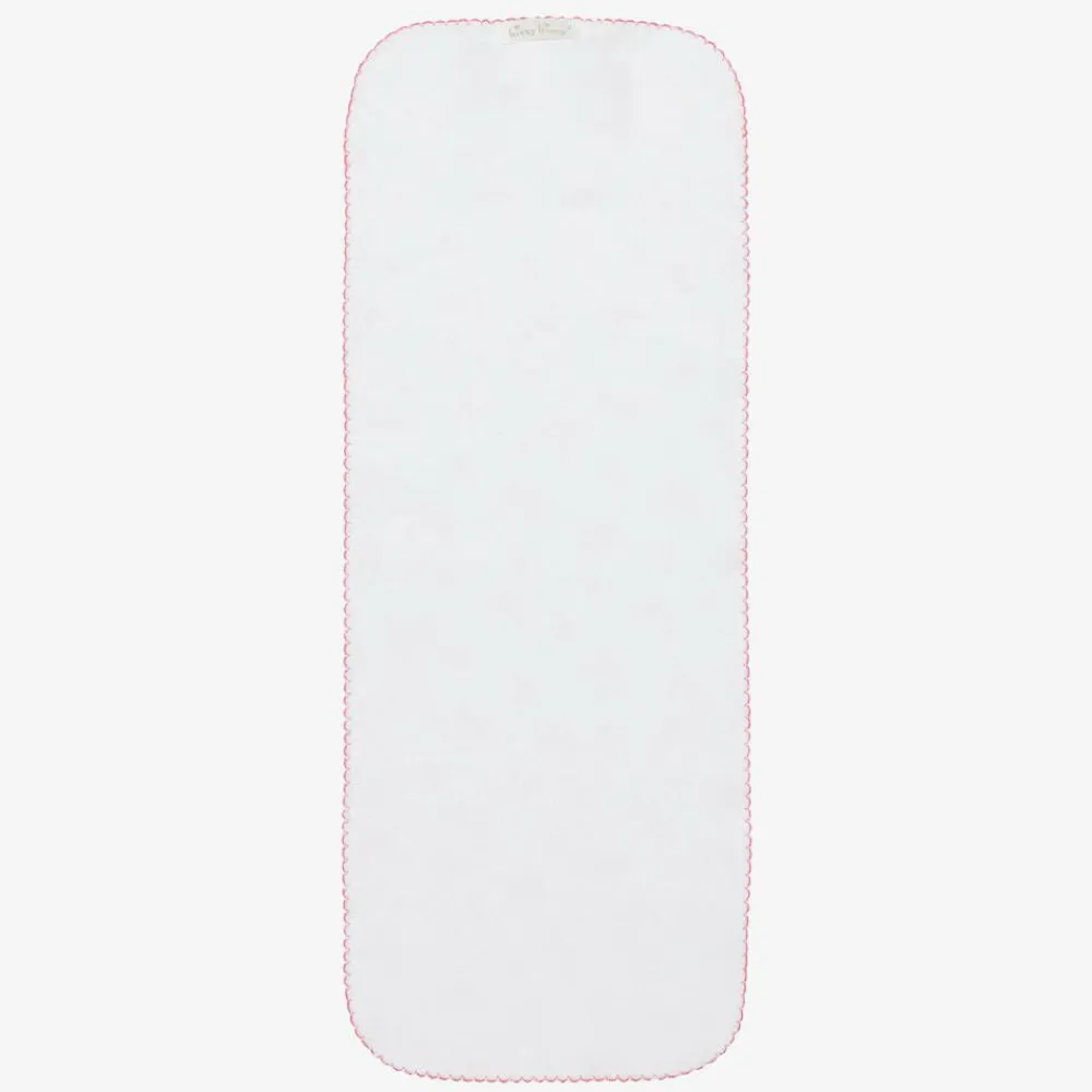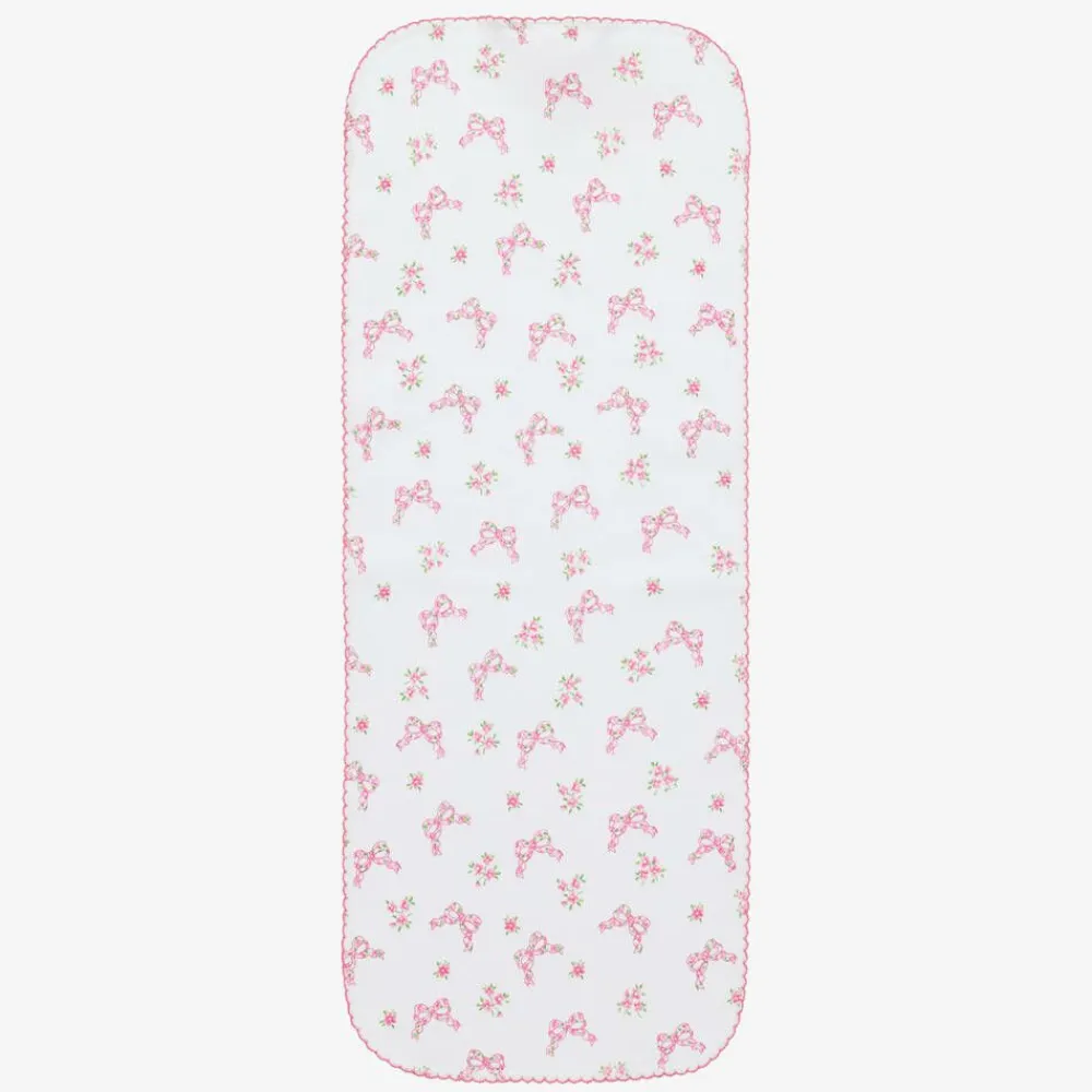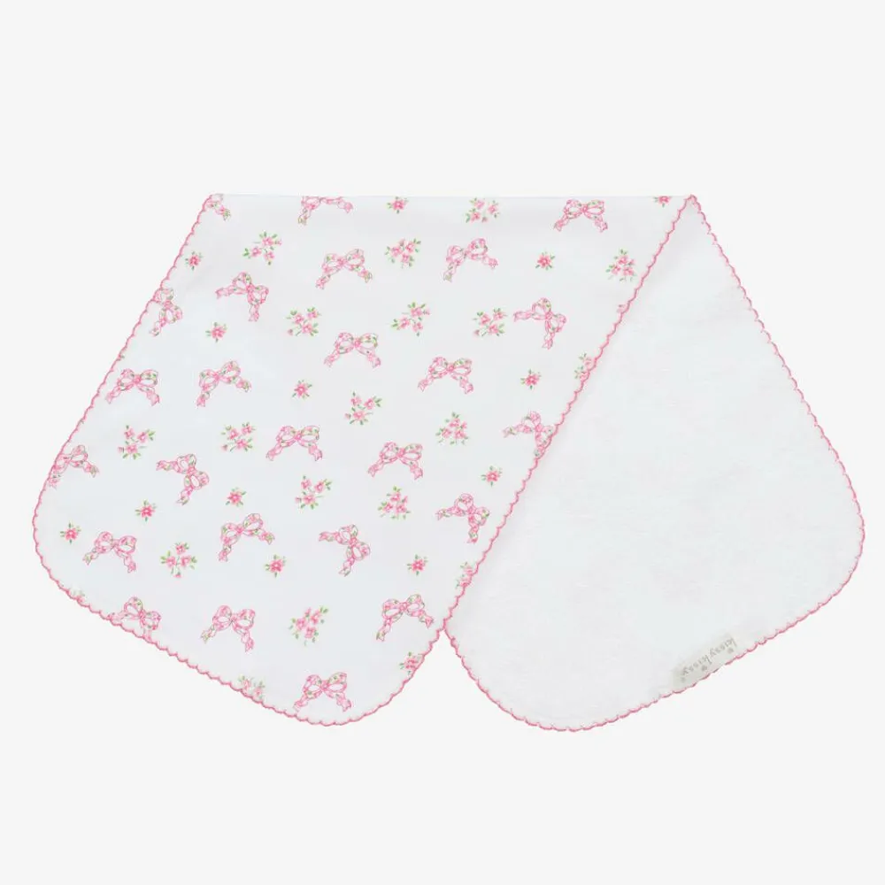 Sweet white burp cloth for baby girls by Kissy Kissy, with a lovely bow and floral print in pink and green. Made in beautifully soft Pima cotton jersey, it has an absorbent cotton towelling backing and pink picot trim. This useful feeding accessory can be placed over the shoulder when burping your baby and used for wiping those little spills after a feed.
