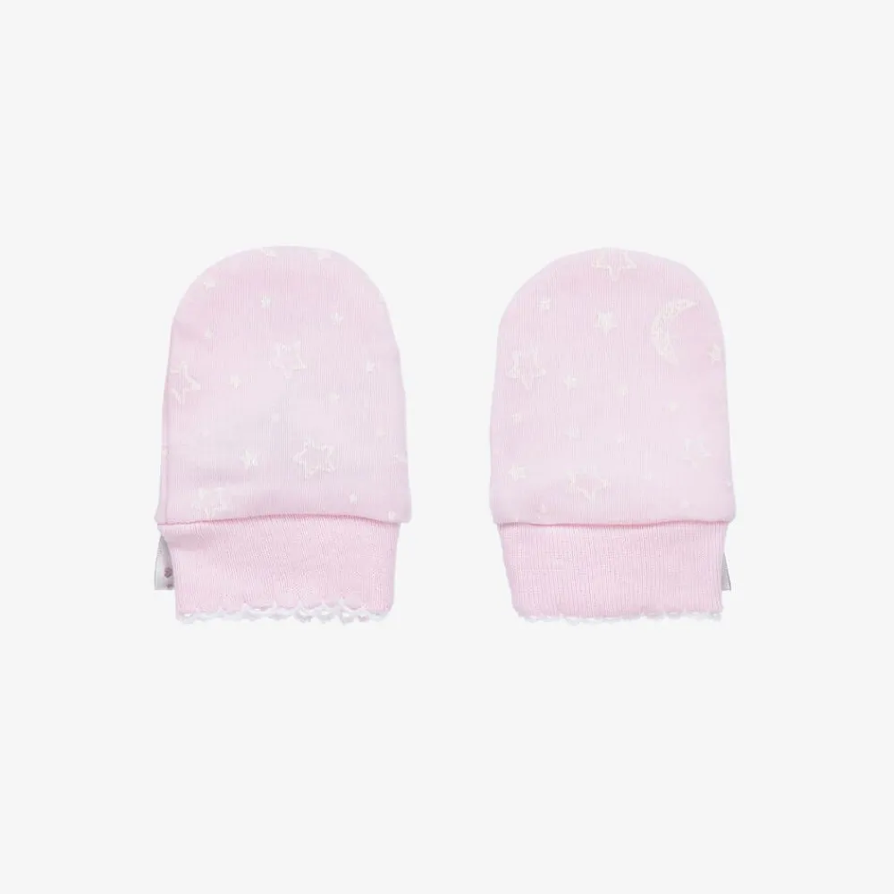 Lovely pale pink scratch mittens for baby girls by Kissy Kissy. They are printed with a charming white stars and moons pattern and have sweet picot trims on the finely ribbed cuffs. Comfortable to wear, they are made from soft Pima cotton jersey.