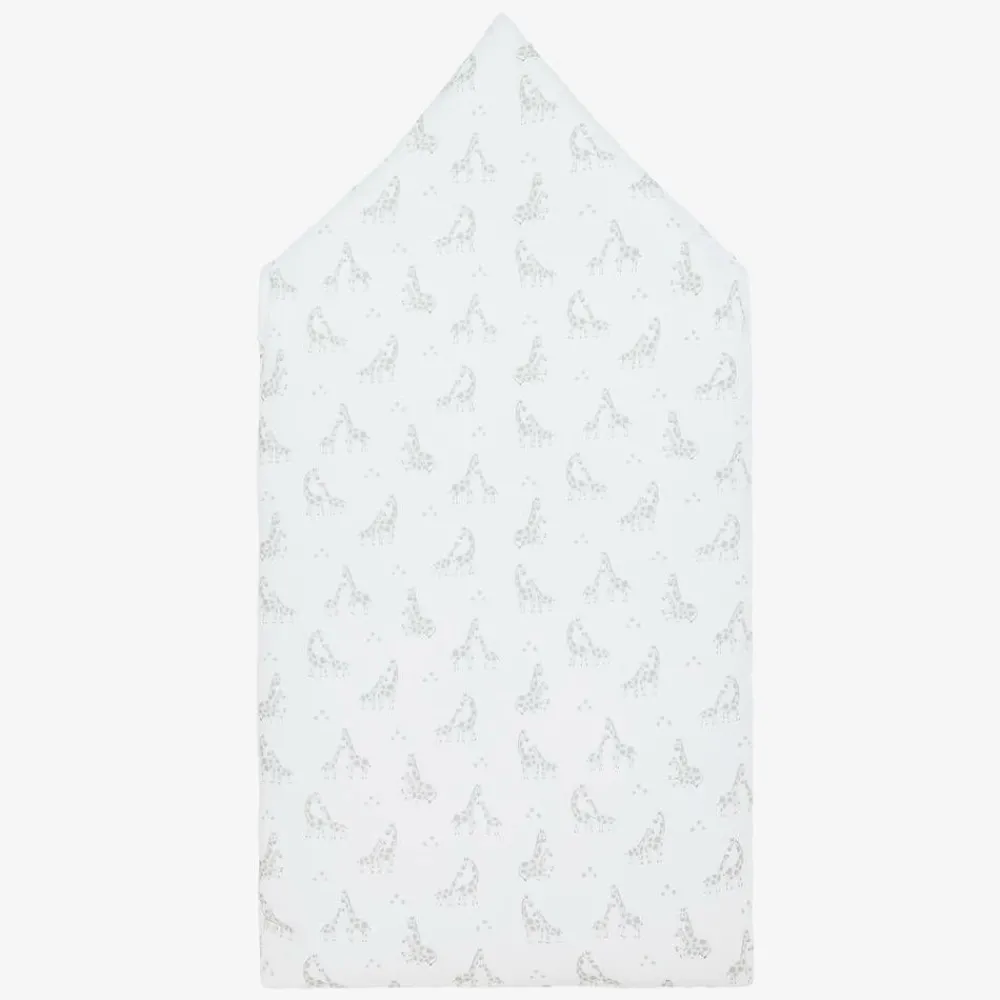 Exclusive to Childrensalon, a lovely white nest for baby boys and girls by Kissy Kissy. Made in super soft Pima cotton jersey, it has a sweet all-over grey pattern of mother and baby giraffes. The nest is gently padded for cosy comfort and warmth, and fastens easily with a zip and single popper on one side. The hood secures with poppers and can be opened out and laid flat as a pillow.