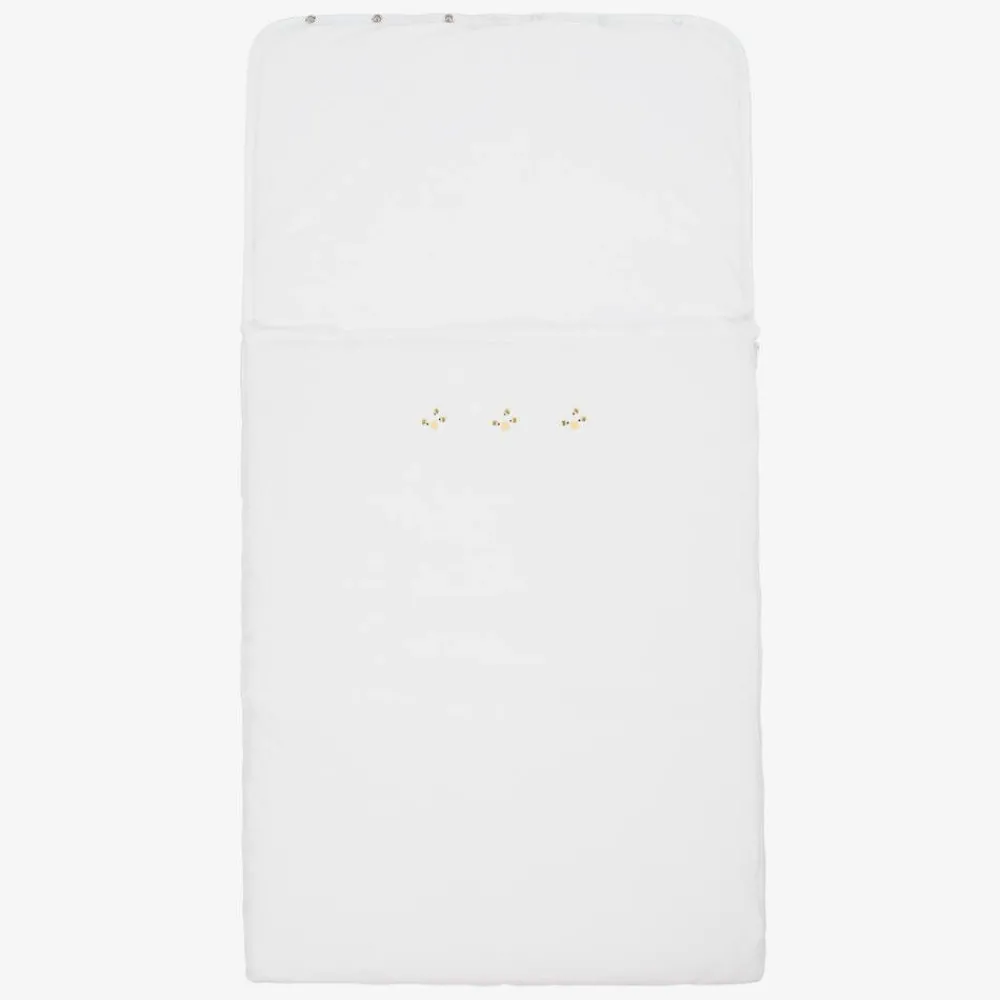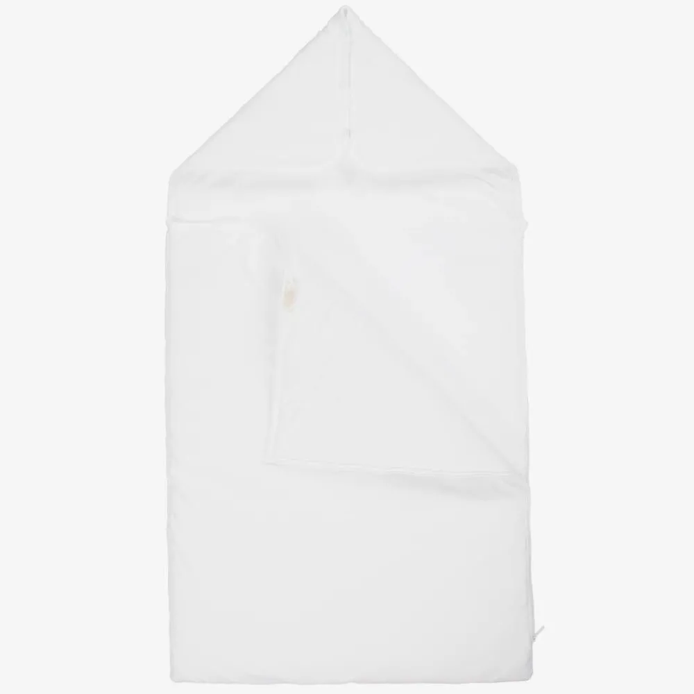 Exclusive to Childrensalon, a white nest for baby boys and girls by Kissy Kissy, made in super soft Pima cotton jersey. Lightly padded for extra warmth, this cosy nest has cute bees and bee hives hand-embroidered on the front. It fastens with a zip along the side and has a popper fastening hood, which can be laid flat and used as a pillow.
