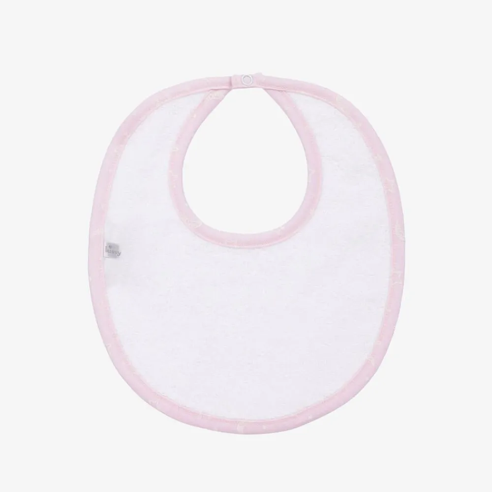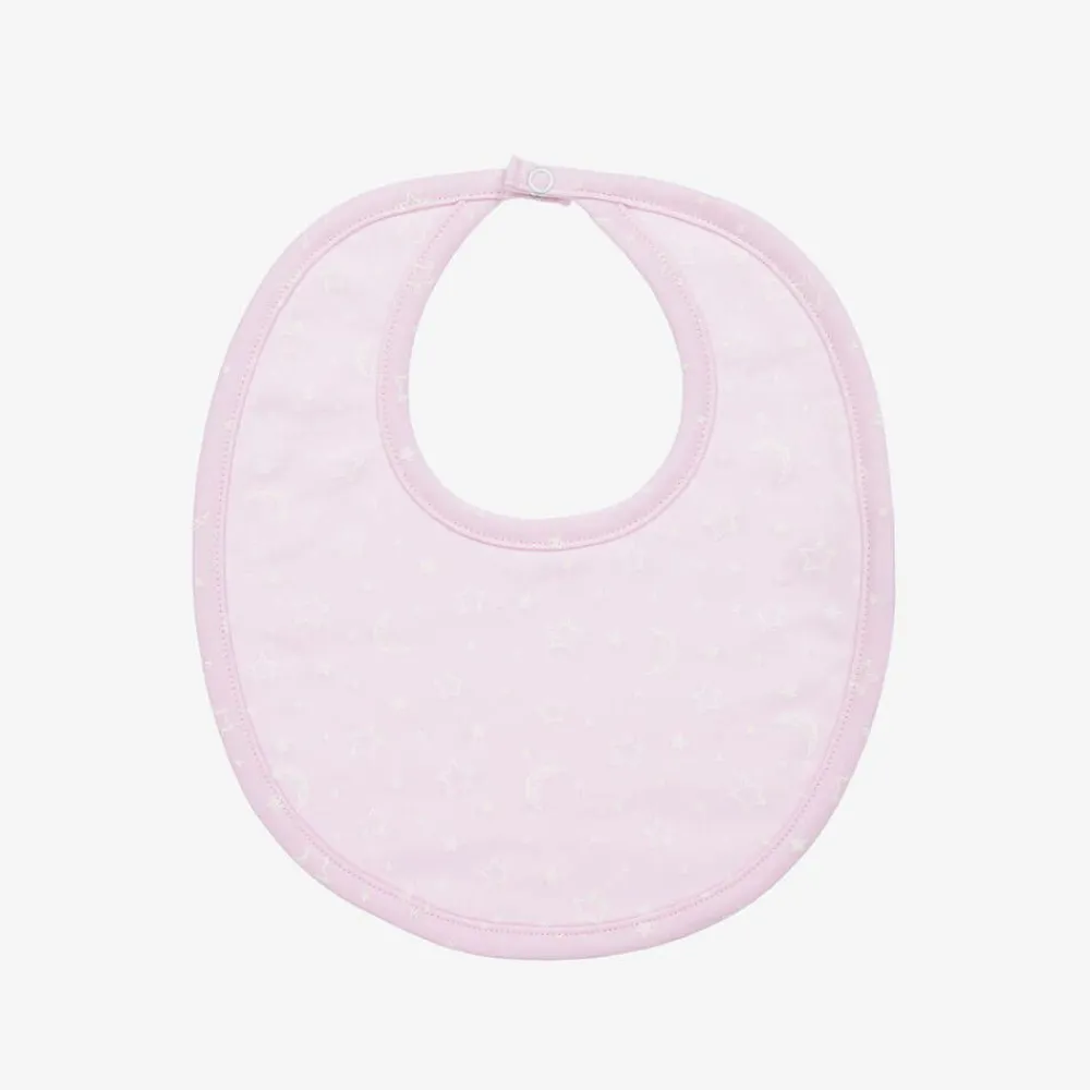 A light pink bib for baby girls by Kissy Kissy, patterned with stars and crescent moons. It is made in super-soft Pima cotton and designed with a towelling underside to help catch those little spills. There is a popper to secure the bib easily on the back of baby's neck.
