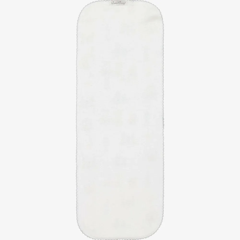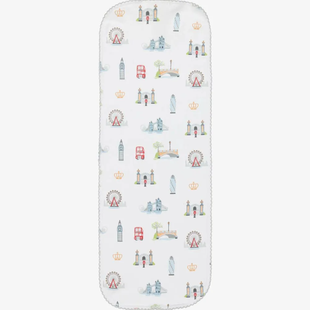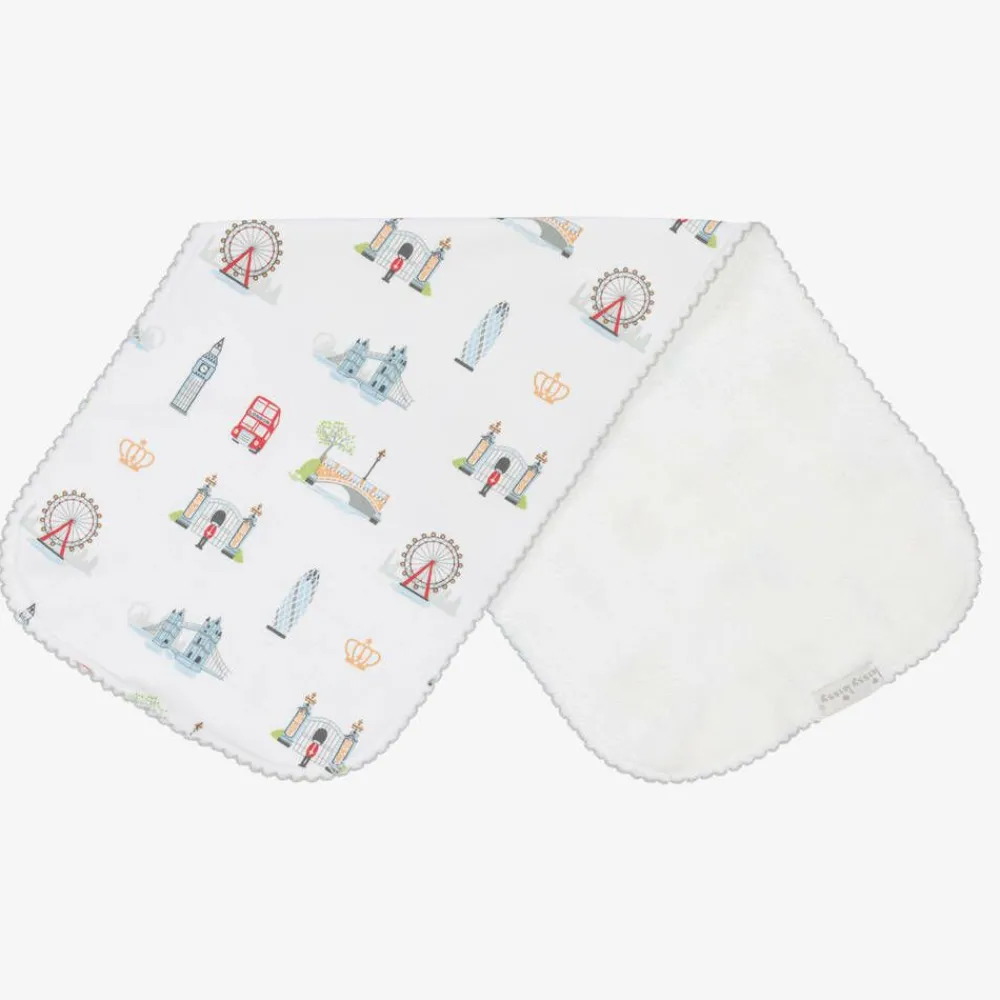 White burping cloth for baby boys and girls by Kissy Kissy, made in super soft and stretchy Pima cotton jersey. In shades of red, blue and beige, the London-themed print features iconic symbols and landmarks in the city. It has a cute, grey picot trim and an absorbent cotton towelling backing. It is ideal for placing over the shoulder when burping your baby after a feed.