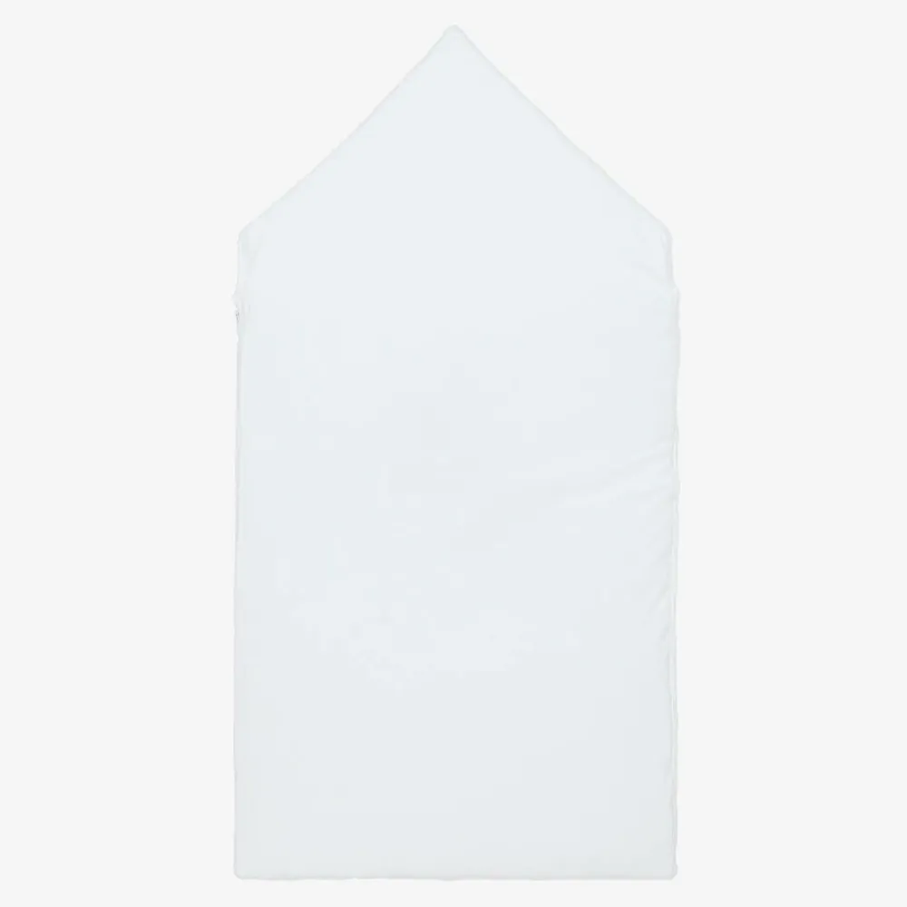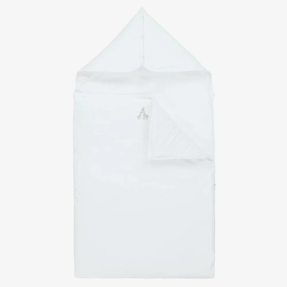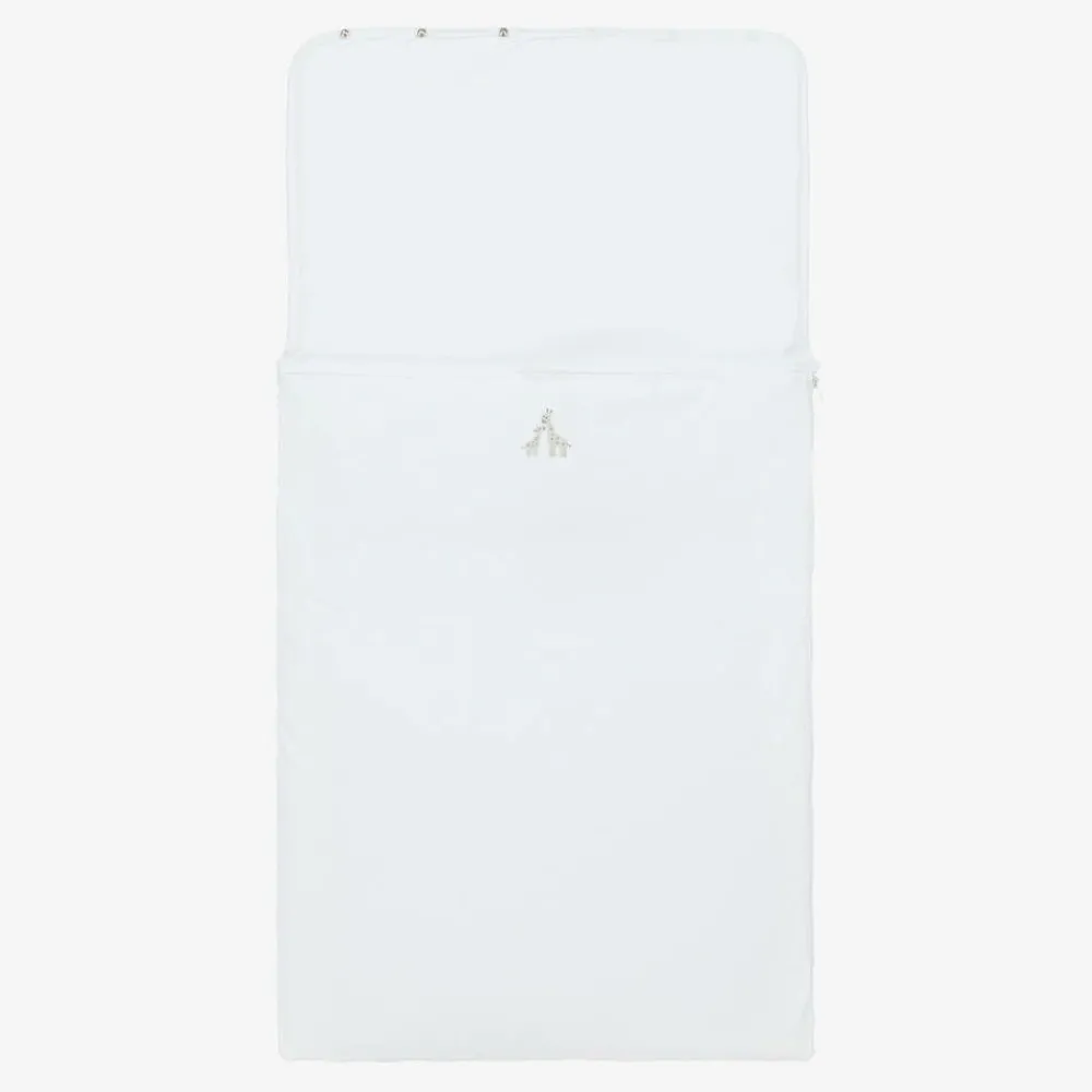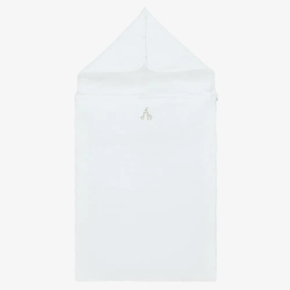 Exclusive to Childrensalon, a white nest for baby boys and girls by Kissy Kissy, made in super soft Pima cotton jersey. Lightly padded for warmth, this cosy nest has cute grey hand-embroidered giraffes on the front. It has a zip fastening on one side and the popper fastenings on the hood can be opened to lay it flat.