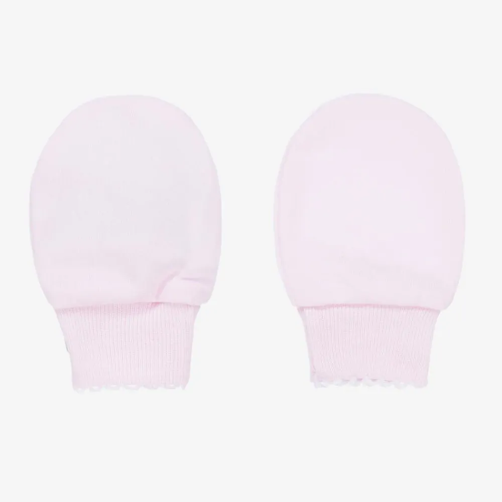 A pair of pale pink scratch mittens for baby girls, by Kissy Kissy. Soft and stretchy, they are made in comfortable Pima cotton jersey, ideal for delicate skin. They have white picot trim and ribbed cuffs, so they stay securely on little hands.