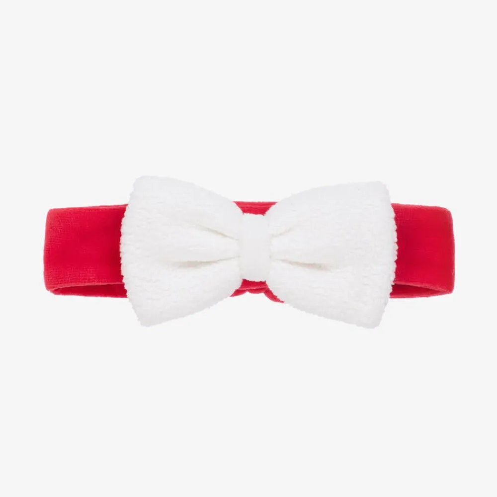 Pretty red hairband for baby girls by Kissy Kissy, made in soft velour. It has a large white bow on the front and an elasticated back for a comfortable fit.