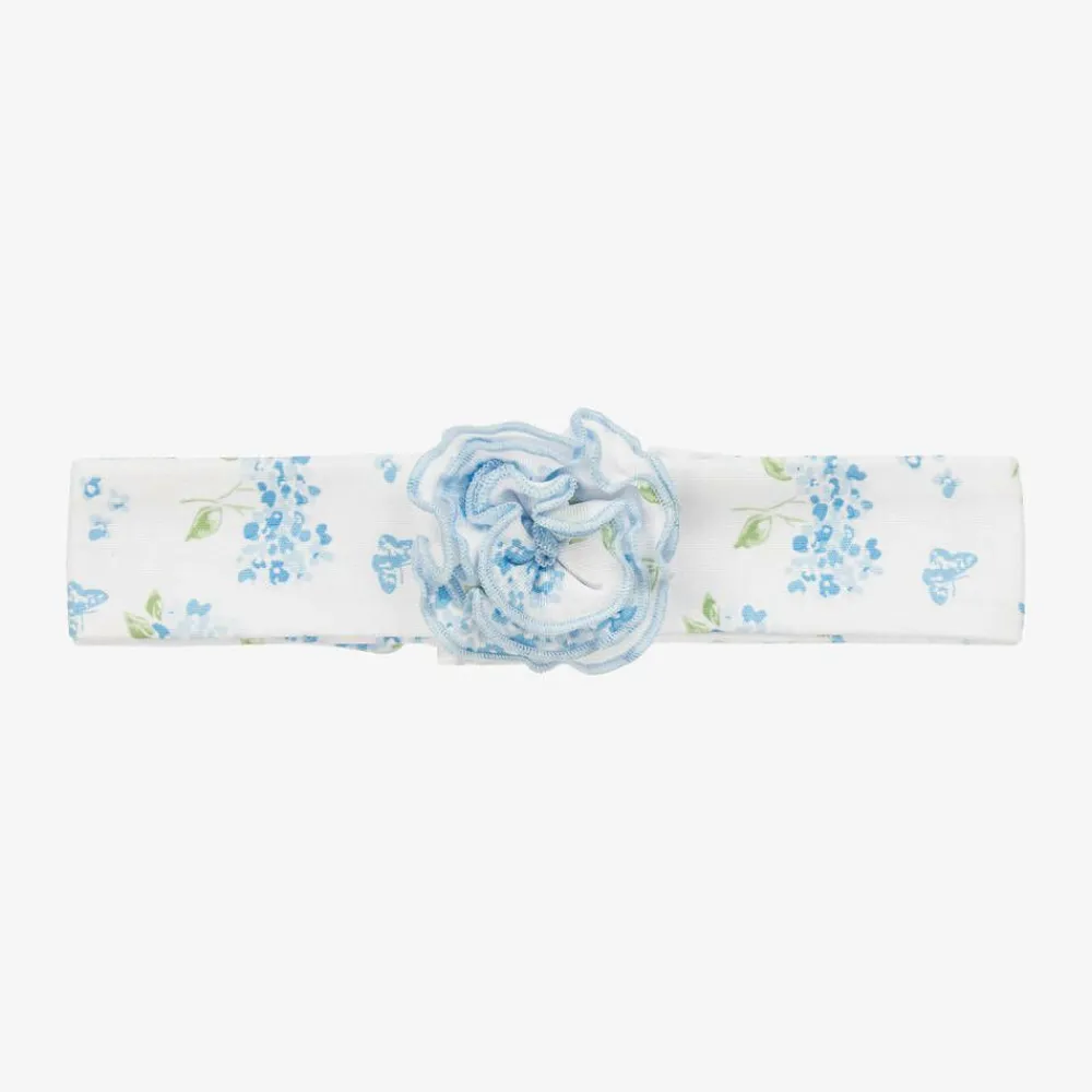 Patterned in a lovely blue floral print against a white background, this charming headband for baby girls is by Kissy Kissy. Gently elasticated at the back, it is made in super soft Pima cotton jersey, with a pretty ruffle flower decoration on the front.