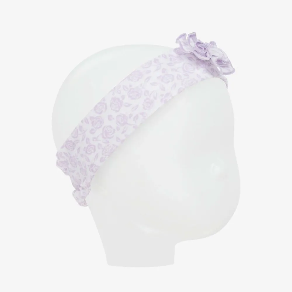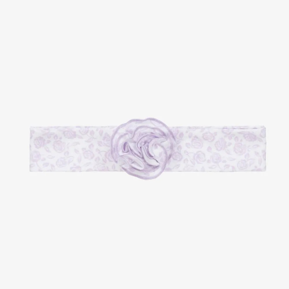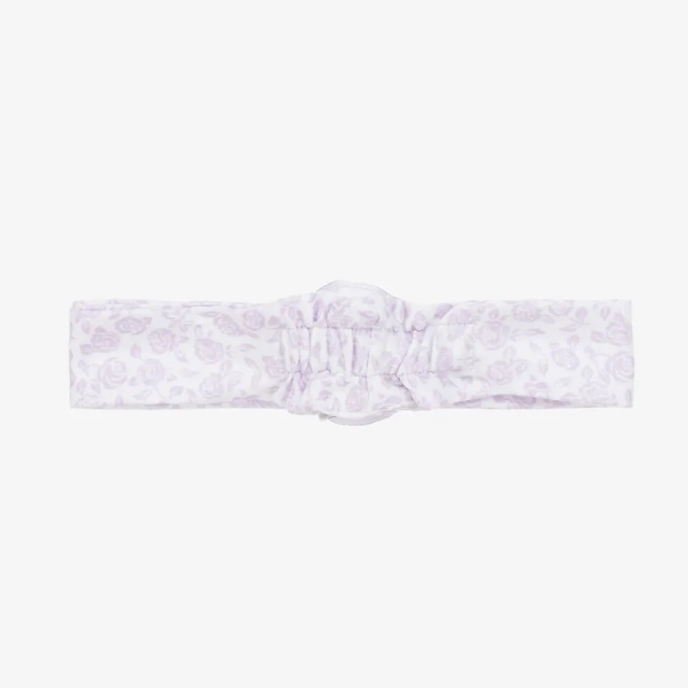 A sweet headband for baby girls by Kissy Kissy, patterned in lilac purple flowers on a white background. Gently elasticated at the back, it is made in super soft Pima cotton jersey, with a pretty ruffle flower decoration on the front.