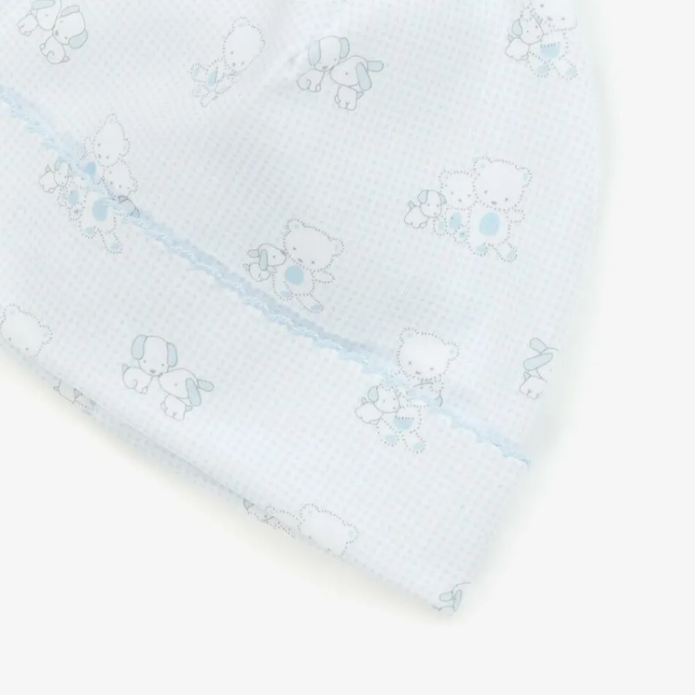 Patterned in tiny micro-dots, this pale blue layette hat for baby boys by Kissy Kissy, has a cute teddy and puppy design. Kind and gentle against delicate skin, it is made in a double layer of Pima cotton jersey, with blue picot embroidery on the turned-up brim.