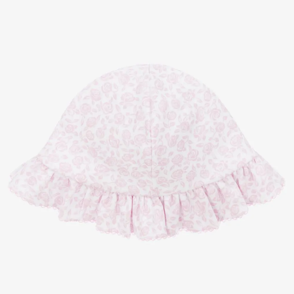 A pretty sun hat for baby girls by Kissy Kissy, patterned in pink flowers on a white background. Made in a double layer of super soft Pima cotton jersey, it has a frilly brim with picot embroidery trim.