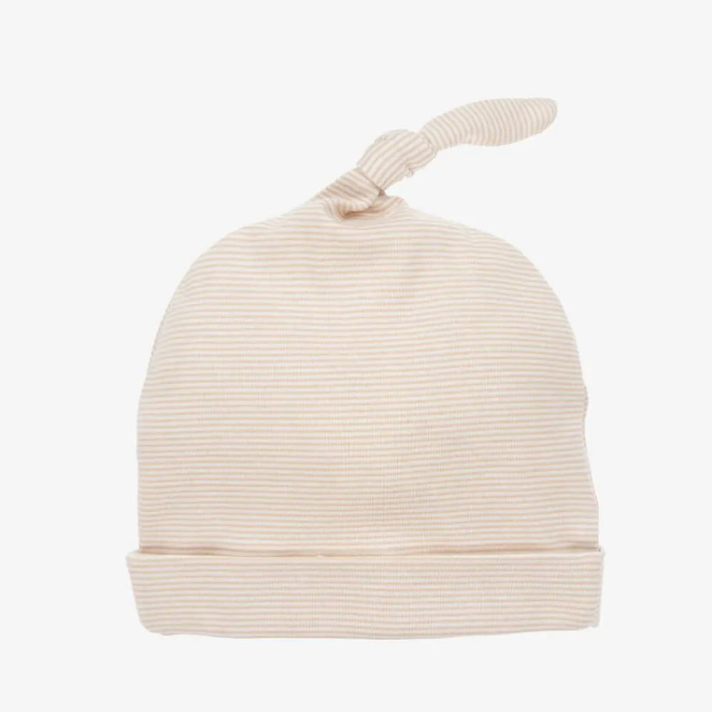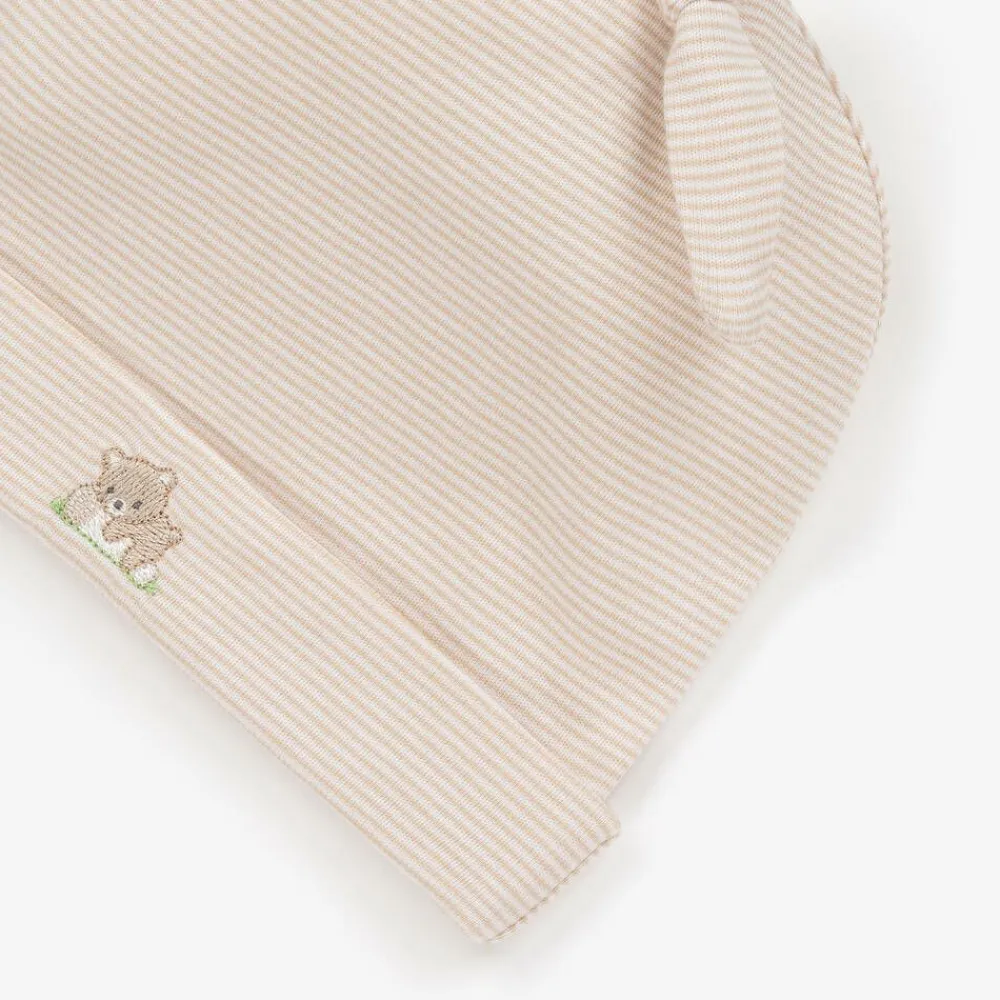 Beige striped hat for baby boys and girls by Kissy Kissy, made from soft and comfortable Pima cotton jersey. Designed with a knot on the top, this sweet hat has a cute little bear cub embroidered on the turned-up brim.