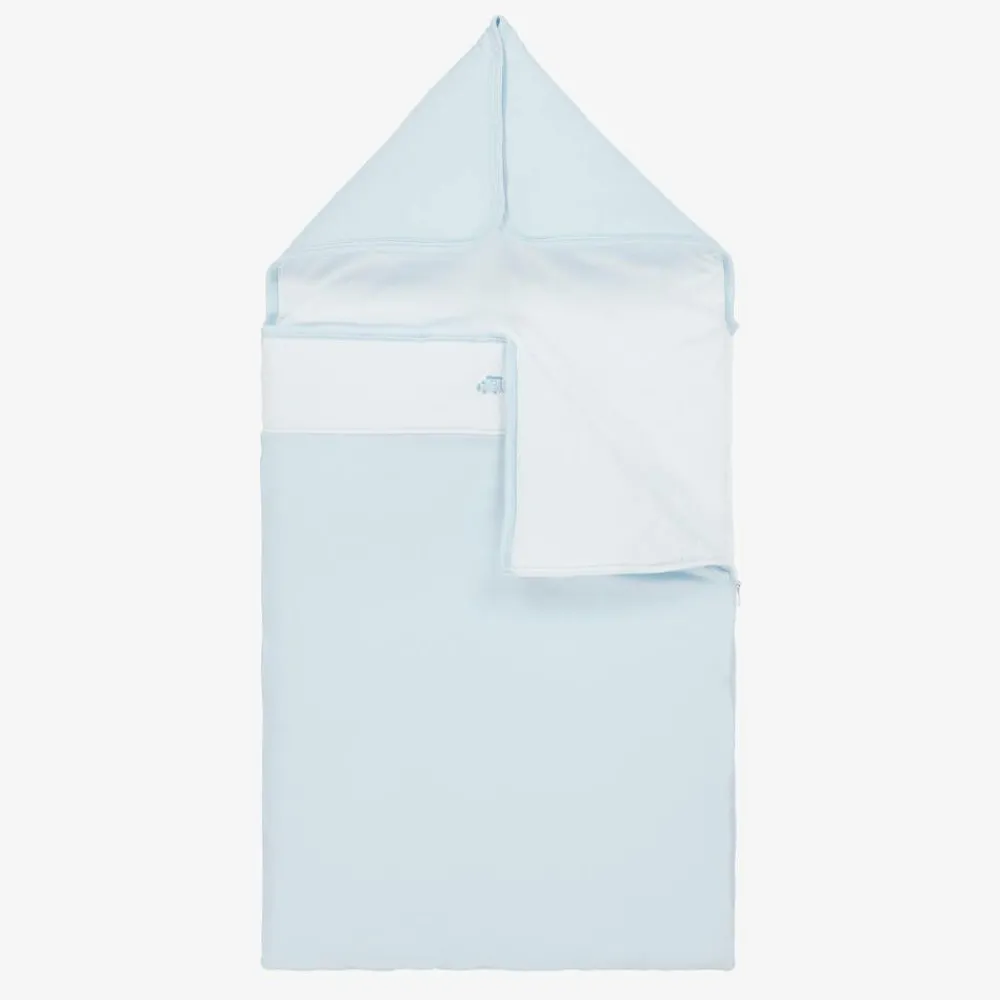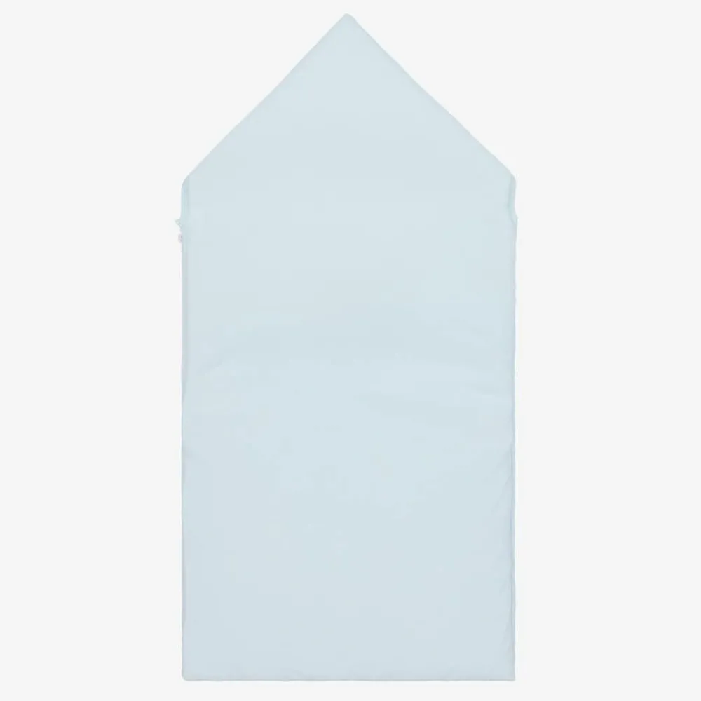Lovely pale blue Pima cotton nest for baby boys by Kissy Kissy, an exclusive to Childrensalon. Beautifully soft to the touch and lightly padded for cosy comfort, this 3-tog jersey nest has a side zip fastening. There is an adorable blue train motif hand embroidered on the white front panel. The hood can be laid flat when the poppers are unfastened.