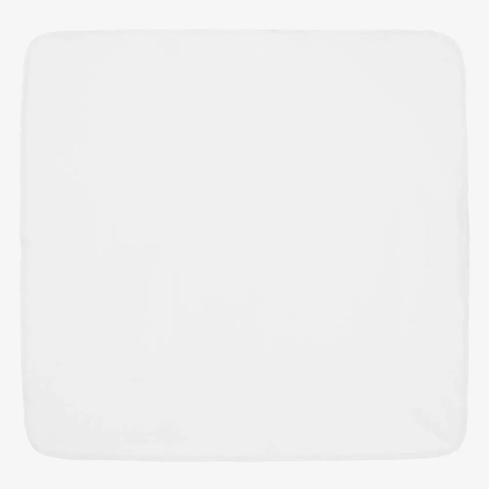 Lovely for bath time, a white hooded towel and mitt set for baby boys by Kissy Kissy. Soft and fluffy, both pieces are made in absorbent cotton towelling, with blue stitching detail along the edges. The hood of the towel is trimmed in super soft cotton jersey, patterned in a sweet dinosaur print in blue, green and beige.