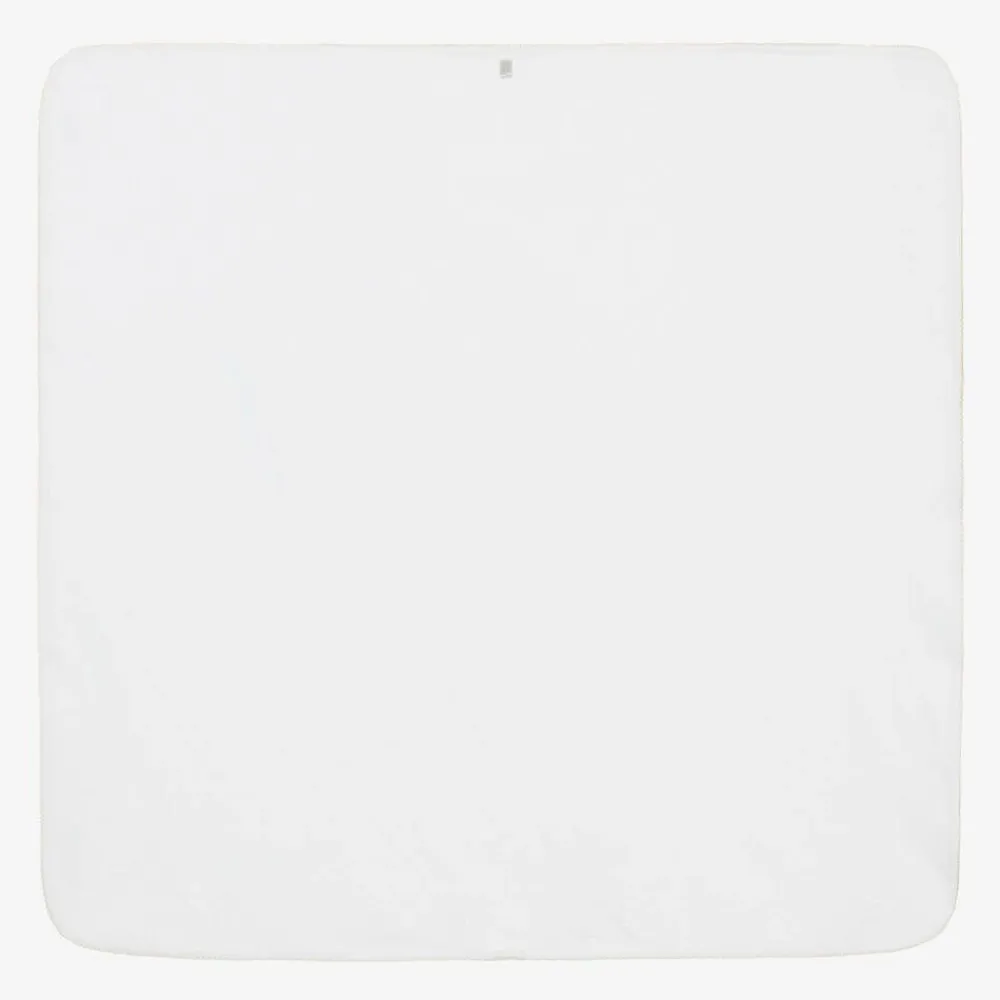 White hooded towel and mitt set for baby boys and girls by Kissy Kissy. Made in fluffy cotton towelling, this cosy towel is ideal for keeping your little one warm and dry after bath time. It has a lovely beige picot trim and cute embroidered baby safari animals on the soft jersey hood. Beautifully soft against delicate skin and absorbent, it comes with a luxuriously soft white wash mitt.