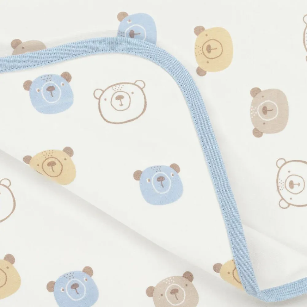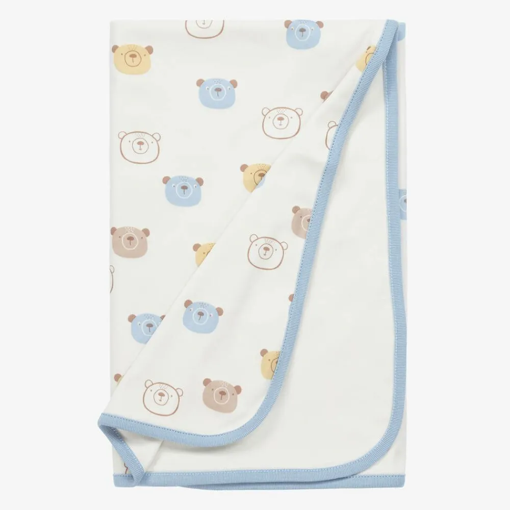Super sweet, this ivory blanket for baby boys by Kissy Love is made from super soft Pima cotton jersey. It has a pale blue ribbed border and is printed with an adorable teddy bear pattern on one side. Gentle on delicate skin, it is ideal for use in the nursery or when out and about in the pram or car seat.