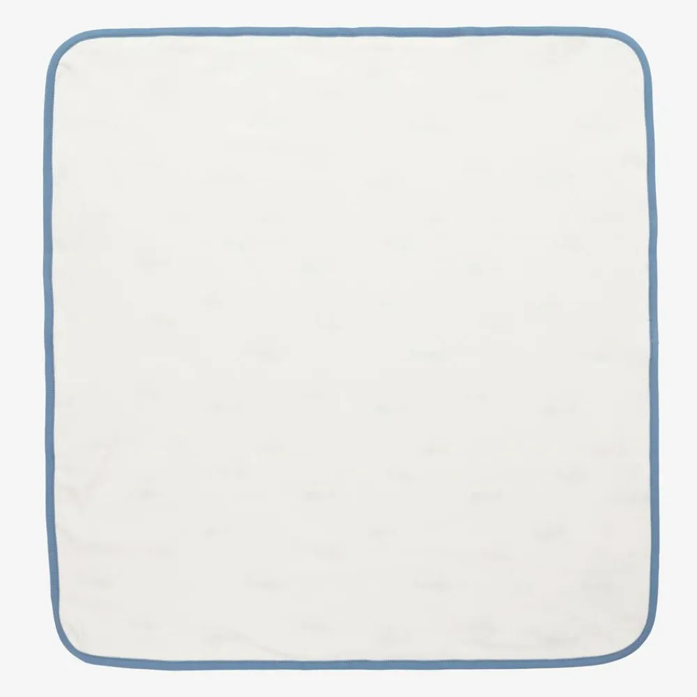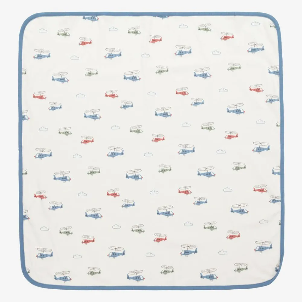 Printed with a fun helicopter pattern, this ivory blanket for baby boys is by Kissy Love. It has a blue ribbed border and is made in a double layer of super soft Pima cotton jersey that is gentle against delicate skin.