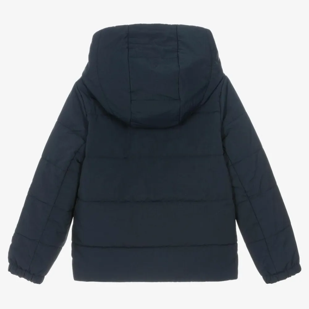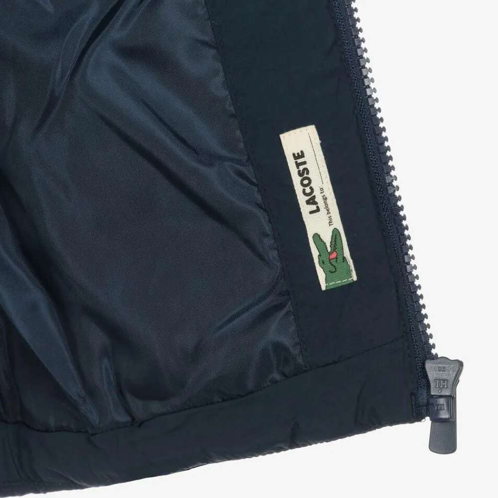 Practical for boys on colder days, this hooded navy blue puffer jacket is by Lacoste. Made in a smooth recycled fabric, this zip-up outerwear has lightweight padding and concealed pockets on the front. The brand's signature crocodile logo is featured on the chest.