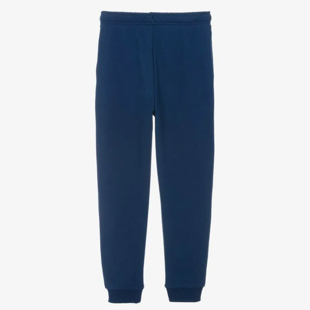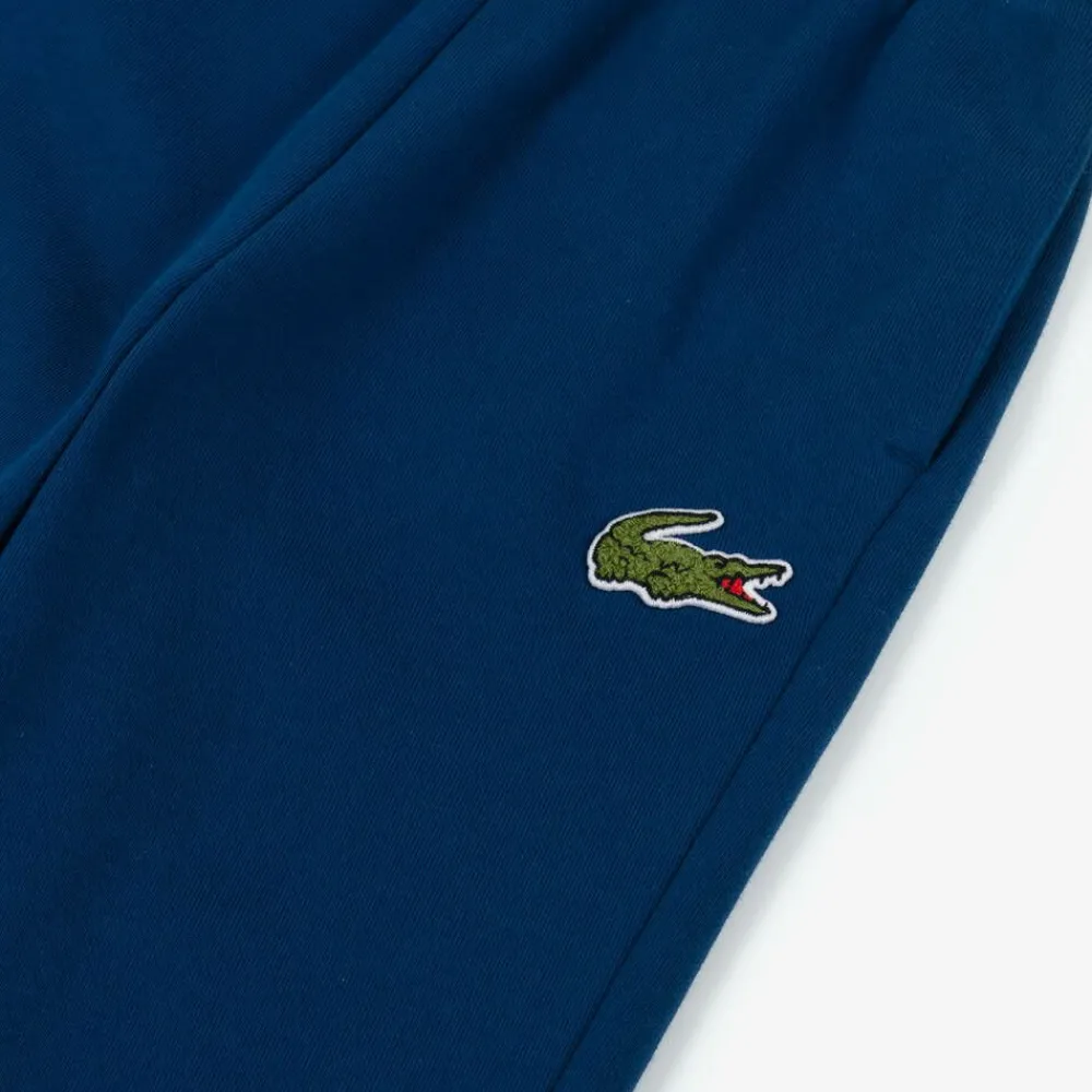 Blue joggers for boys by Lacoste, made in soft, mid-weight organic cotton jersey. Casual and comfortable, they have side seam pockets and an internal drawstring waist for a comfortable fit. The iconic embroidered crocodile logo is on the front for instant brand recognition.