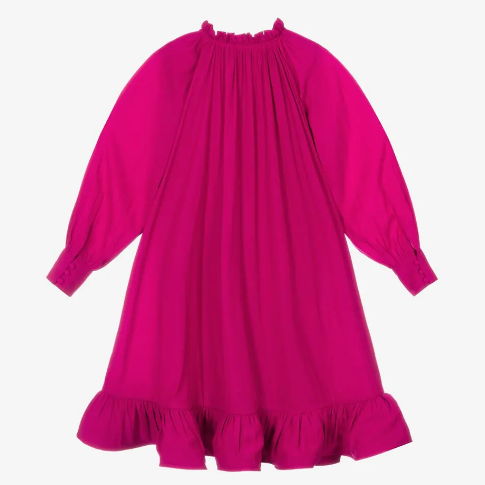 Gorgeous fuchsia pink dress for girls by luxury French brand Lanvin, ideal for a special occasion. Silky smooth and lightweight, it has a soft lining for comfort. Inspired by the iconic 'Charmeuse' dress in the adult collection, this elegant style has long sleeves and a striking crinoline ruffle hem, weighted so the dress hangs beautifully and slightly longer at the back. There is a ruffle trim around the neck and button fastenings on the front and cuffs. For a discreet designer statement, there is a signature gold metal 'Arpège' button at the neck and a gold metal logo disc by the hem.