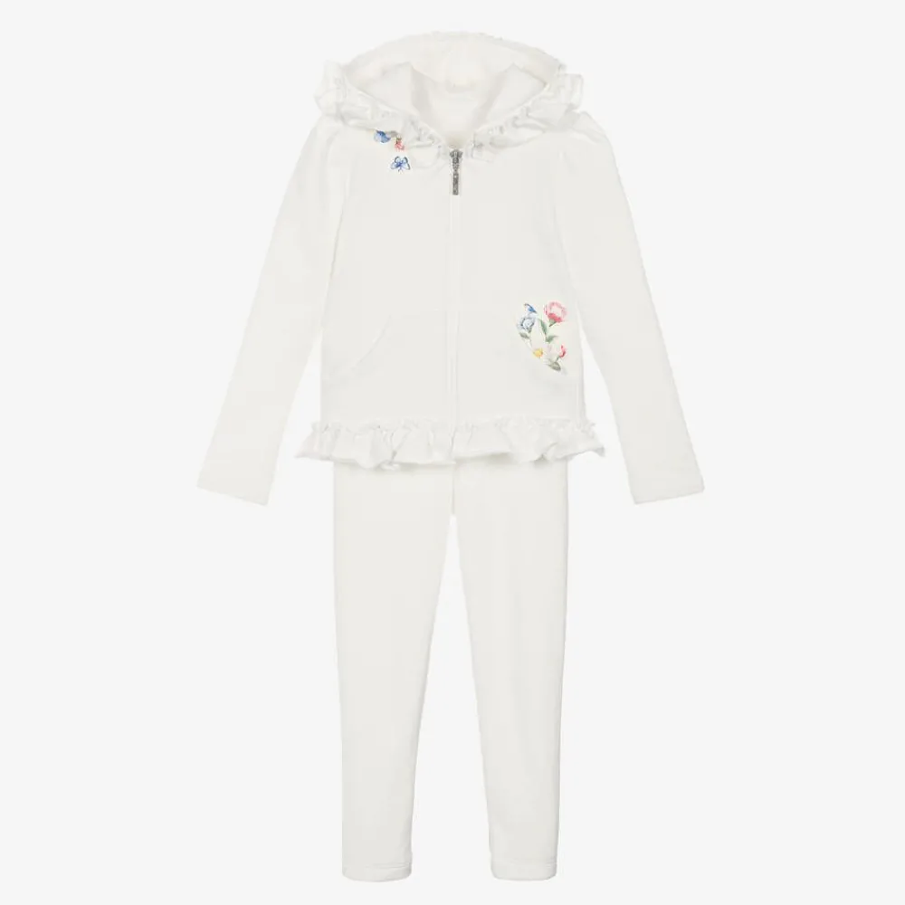 Pretty ivory cotton leggings set for girls by Lapin House. The soft, stretchy jersey zip-up hoodie has frills and floral motifs in pink and blue, with a cosy, fleecy lining. The super soft velour leggings are full-length and have an elasticated waist for a comfortable fit.