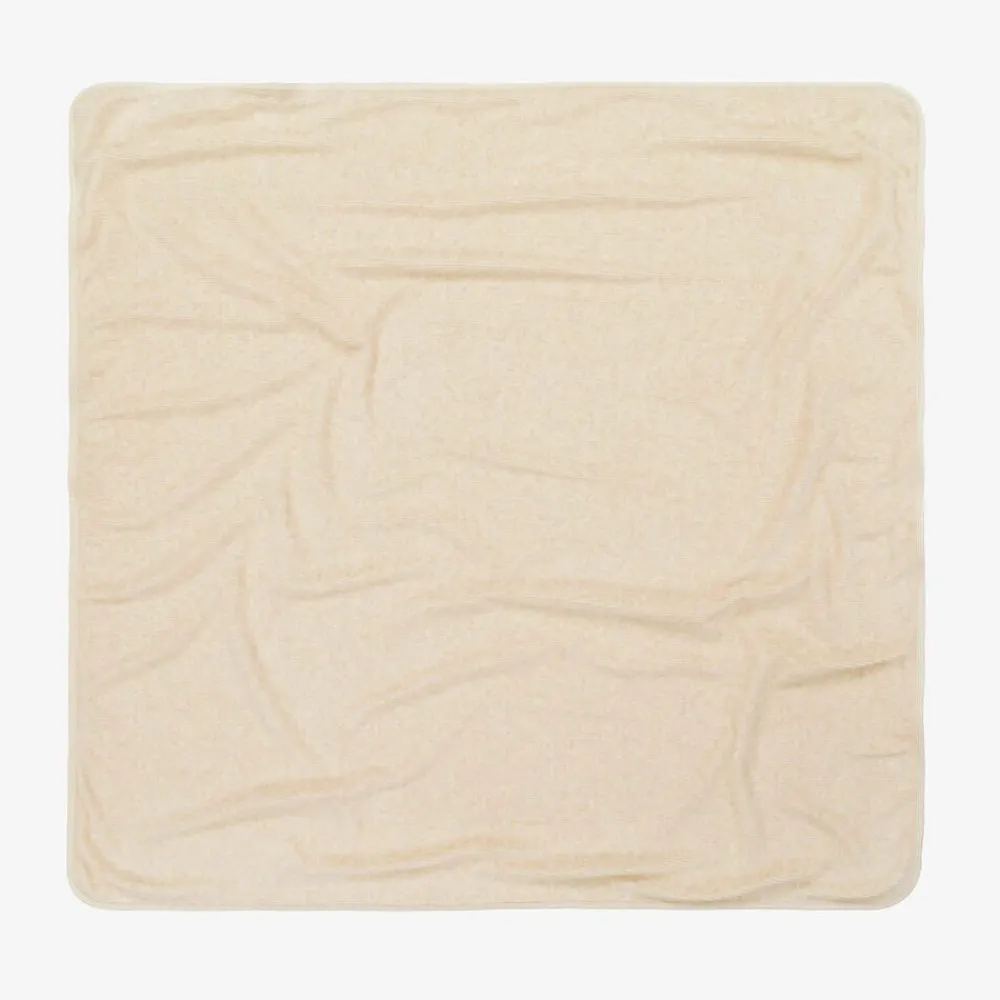 Ivory organic cotton blanket for girls by Portuguese brand Laranjinha, with a sweet, stylised floral print in beige. Made in soft, stretchy jersey, it is trimmed in beige, with a coordinating, ribbed velour lining. It is ideal for both the nursery and for when out and about in the pram or car.