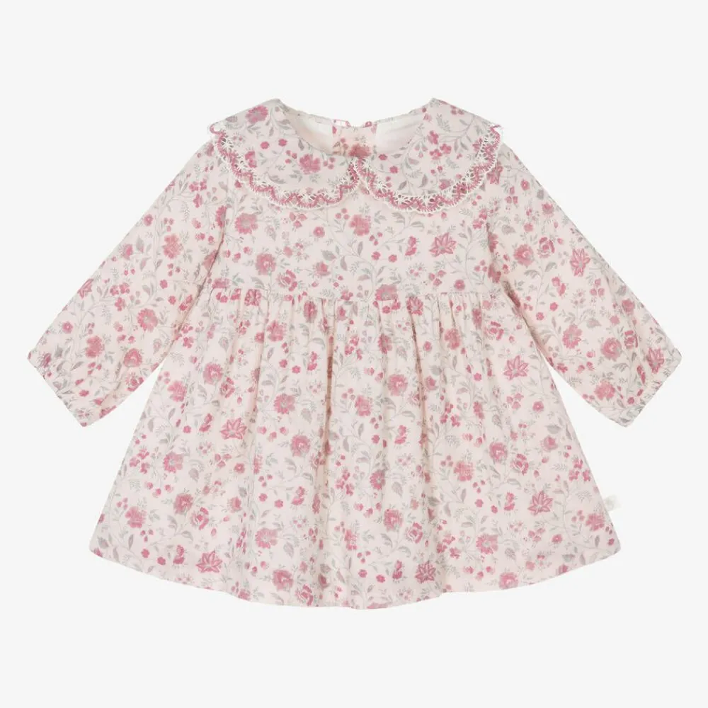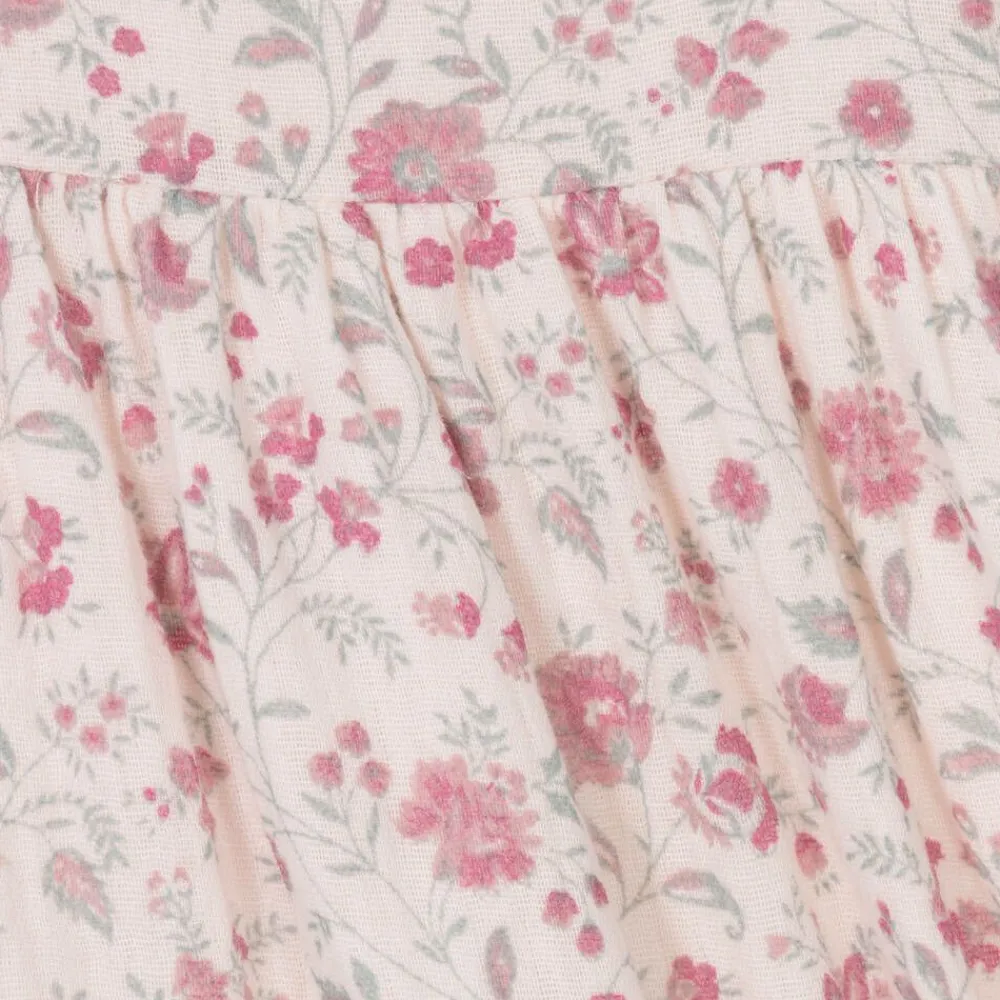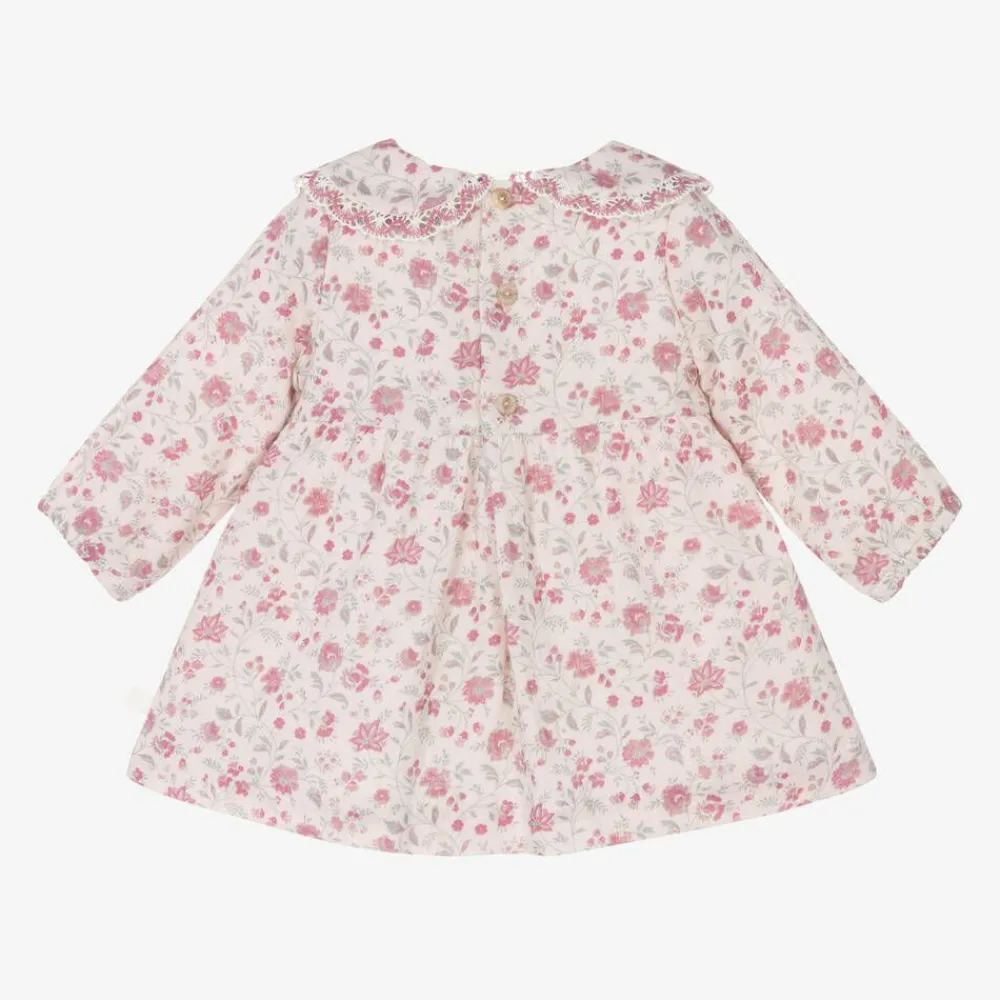 Pretty blush pink dress for little girls by Laranjinha, woven in lightweight organic cotton muslin. Patterned with sweet ditsy florals, this traditional style has a rounded collar with delicate lace trims and long puffed sleeves. It fastens with buttons on the back and is lined in lightweight cotton for gentle comfort against delicate skin.