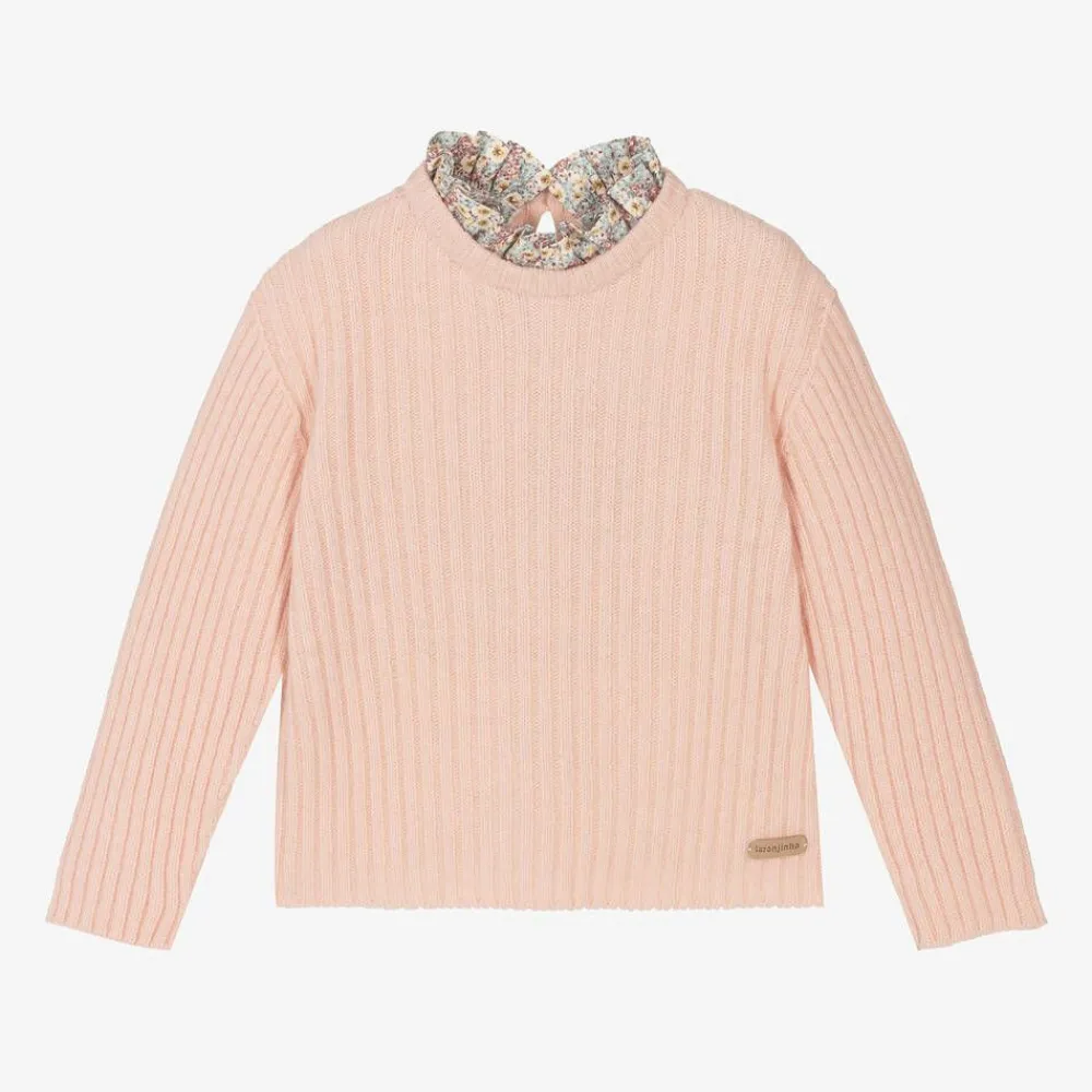 Pink ribbed sweater for girls by Portuguese brand Laranjinha. Warm and cosy, it is knitted in a soft wool, cashmere and viscose blend and has a detachable, floral ruffle collar, secured with poppers. There is a simple keyhole button fastening on the back of the neck.