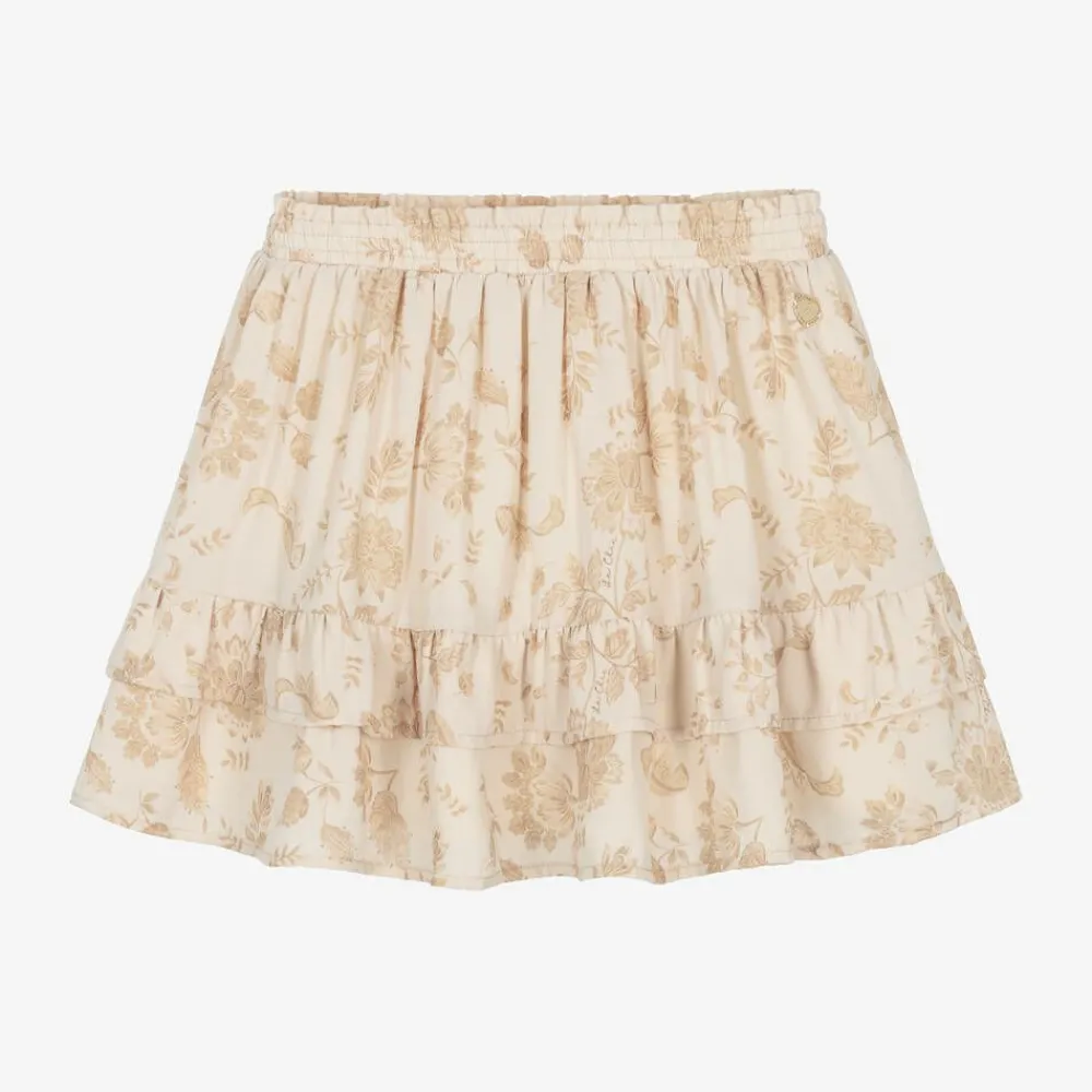 Pretty beige skirt for girls by Le Chic, with a tonal floral print. It is made in soft, crêpe chiffon, with a lovely ruffled hem and a gold heart logo charm on the hip. For comfortable wear, it has a lightweight cotton lining and a stretchy, elasticated waistband.