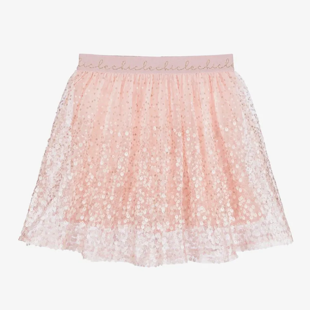 Eye-catching pink skirt for girls by Le Chic, made in layered tulle and shimmering with sequins. The comfortable, elasticated waistband has glittery gold, repeat logos all around. The voile lining has a tulle frill to create extra volume.
