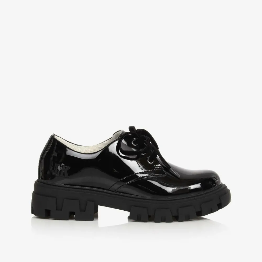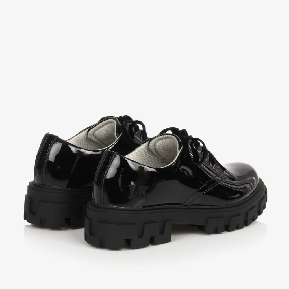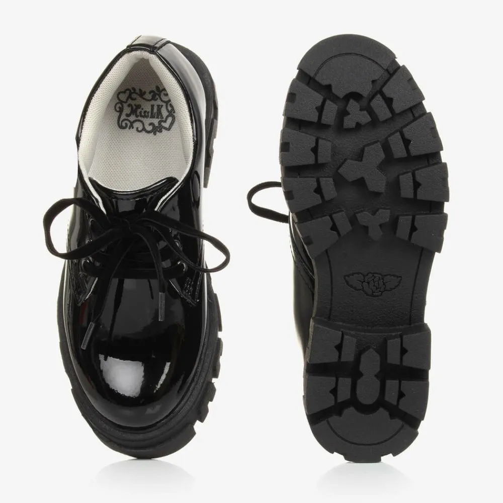 Chunky black shoes for girls by Lelli Kelly, made in patent leather with a lovely shine. Ideal for school, they are lined in soft fabric and have a supportive, cushioned insole which can be removed. The rubberised outer sole has oversized, deep ridges for a contemporary look and helps provide extra grip. They fasten with stylish black velvet laces and come with a spare pair of plain black laces for an alternative look.