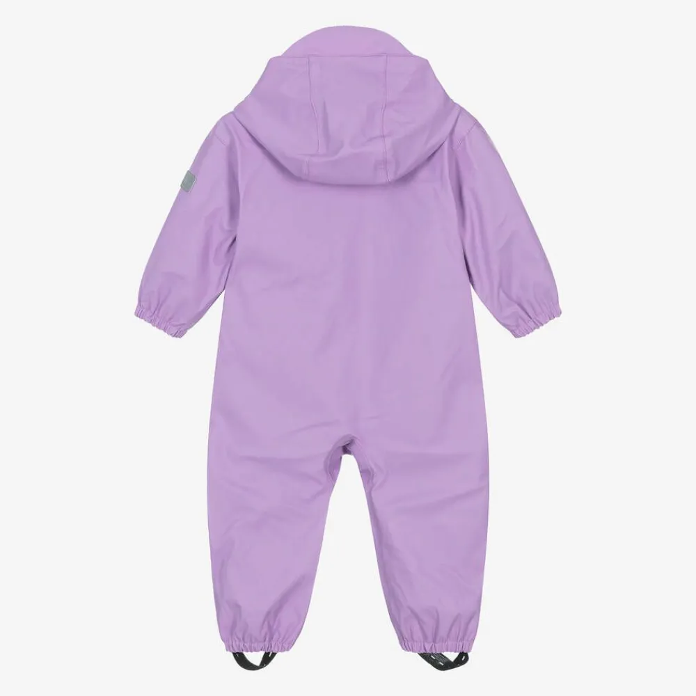 A purple rainsuit for girls by Hatley, made in a smooth and lightweight waterproof fabric. Fun yet functional, it has a hood with a protective peak and a light reflective badge for high visibility. Your child can confidently jump in muddy puddles, fixed with elasticated foot straps that adjust with buttons to keep out the wet. Easy to take on and off, it secures with a full-length zip and has a soft towelling lining.