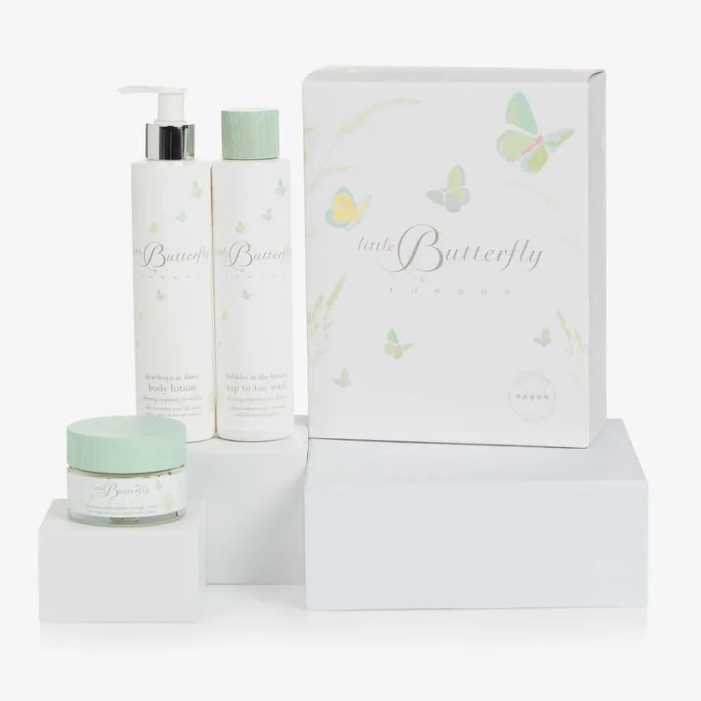 A lovely gift set to welcome precious boys and girls by Little Butterfly London, gentle enough to use from birth. Certified organic, the set comprises body lotion, nappy change cream and bubble bath, all designed to cleanse, nourish and soothe even the most sensitive of skin. Delicately scented with naturally derived ingredients, it is hypoallergenic and suitable for eczema-prone skin.