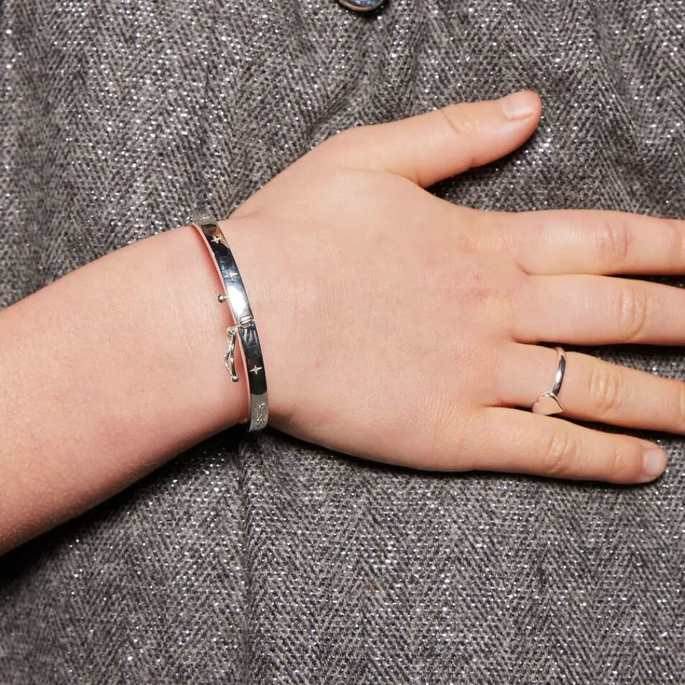 A beautiful bangle for boys and girls by British designer Little Star, made in sterling silver. Delicate and timeless, this elegant design features six luxurious diamonds set on dainty star-engravings. Its hinge-clasp fastening ensures ease of dressing. A wonderful present option, the bangle comes with a fabric pouch, box and gift bag.