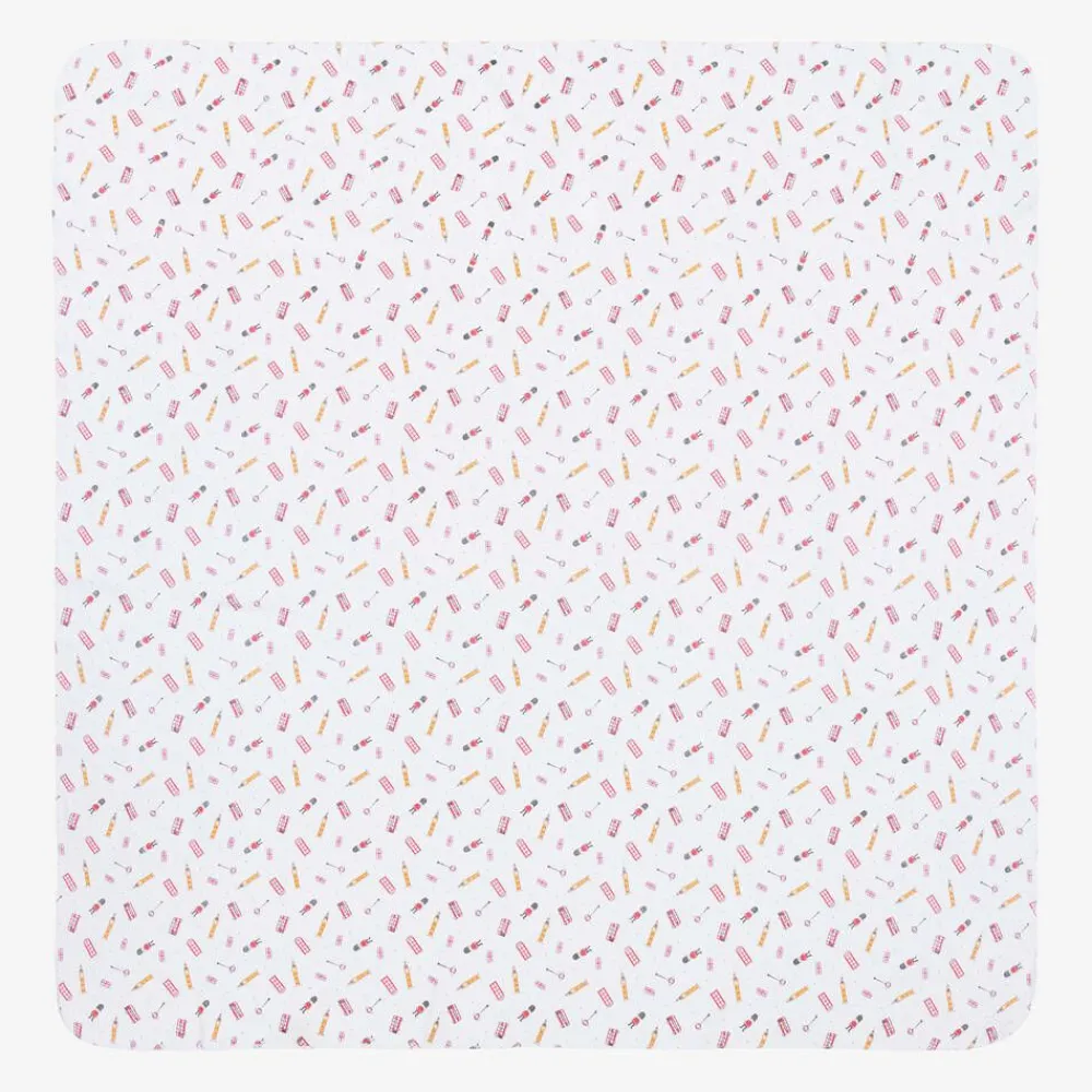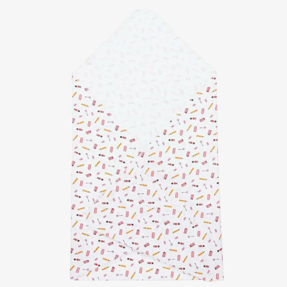 Cute white swaddle blanket for boys and girls by Magnolia Baby, printed with iconic London images in red and yellow. Made in super soft Pima cotton jersey, it is breathable and lightweight, making it easy for swaddling. A versatile accessory, it can also be used as a nursing cover or when out and about in the pram or car seat.