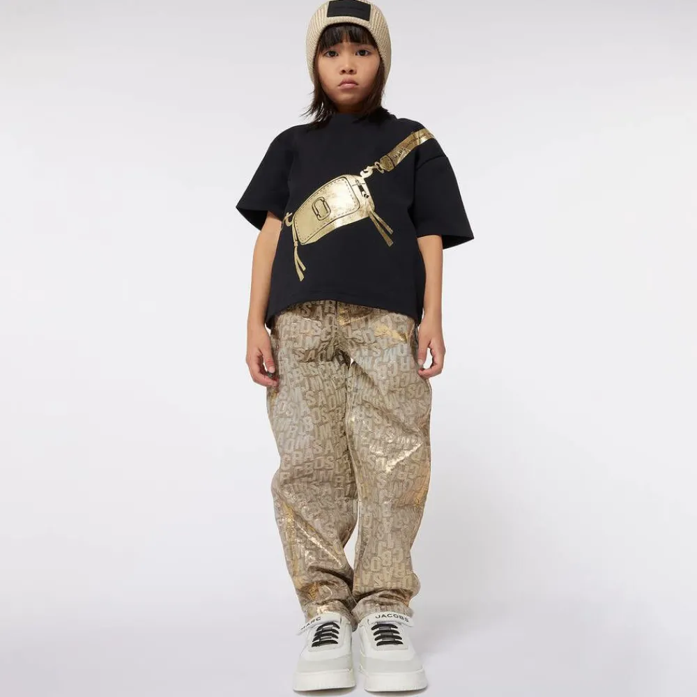Black T-shirt for girls by MARC JACOBS, with a gold cross-body bag printed on the front. The eye-catching bag has a shiny metallic finish and features the designer's signature logo on the shoulder strap. Trimmed with a branded tab on the side seam, this cool tee is made in soft cotton jersey, in a comfortable oversized fit.