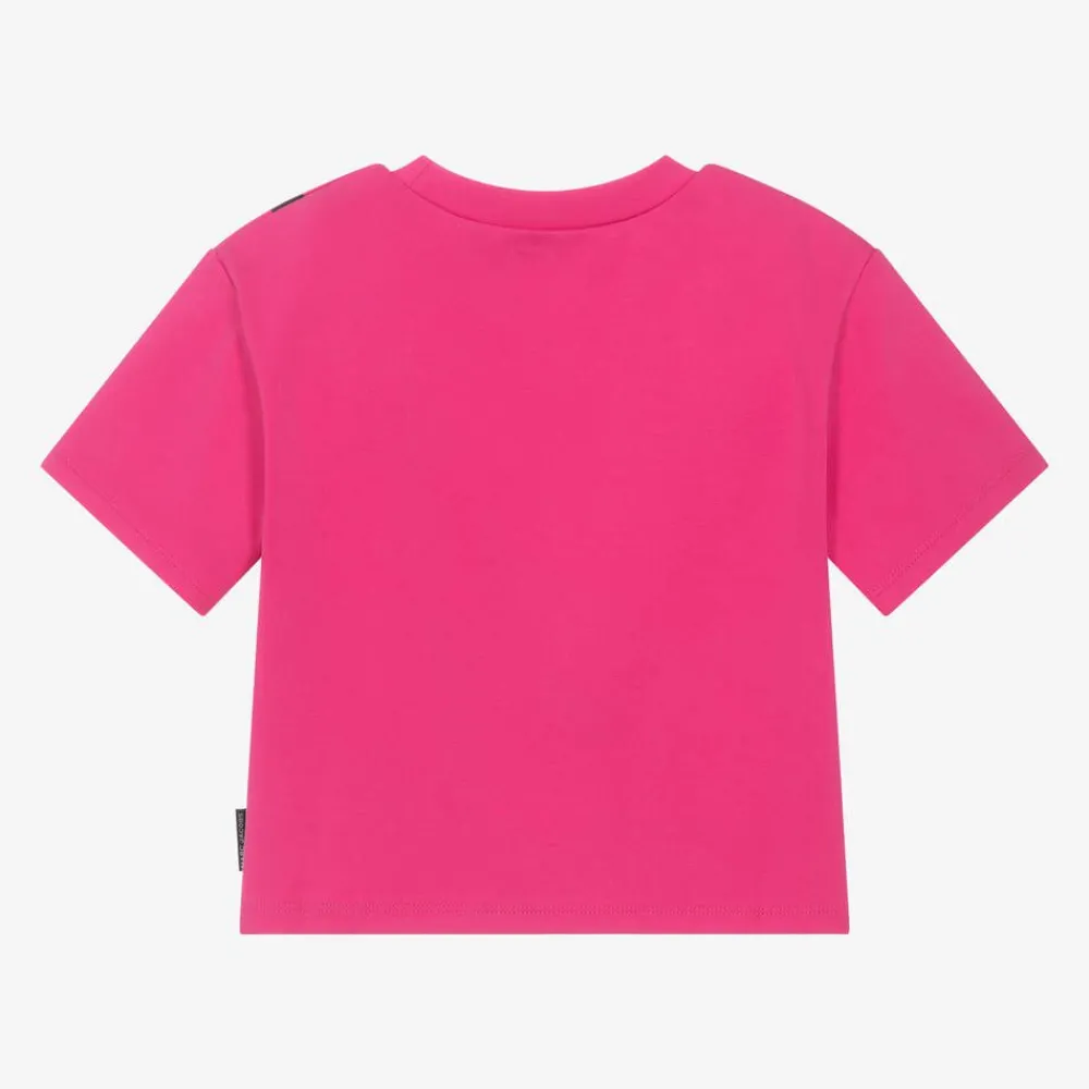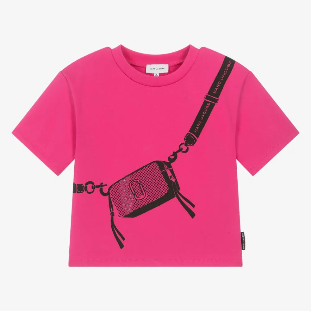 Fuchsia pink T-shirt for girls by MARC JACOBS, with a black cross-body bag printed on the front. The eye-catching bag is embellished with shiny black studs and features the designer's signature logo on the shoulder strap. Trimmed with a branded tab on the side seam, this cool tee is made in soft cotton jersey, in a comfortable oversized fit.