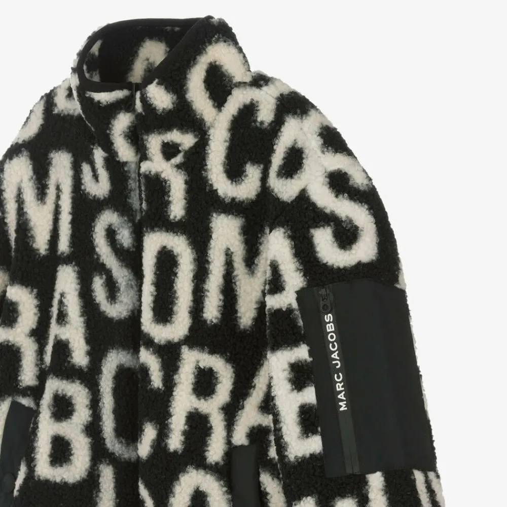 Black and ivory zip-up top for boys and girls by MARC JACOBS. A statement look, the sherpa fleece fabric bears the label's distinctive jumbled logo pattern. Lined with cosy polar fleece and lightly padded, it has a branded zip-up pocket on the sleeve, a stand-up collar, and popper-closing front pockets. It fastens with a logo-engraved zip on the front for that extra touch of branding.